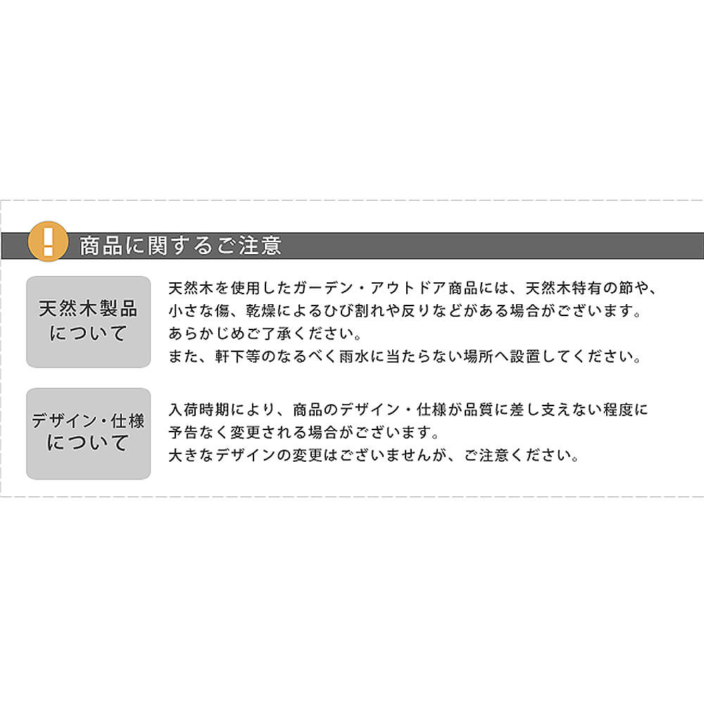 | 備考 | 完成品 ※天然木のため、色褪せやひび割れが発生する場合があります。ホームセンターで販売されている木材の保護塗料で塗り直しいただくなど、定期的なメンテナンスをおすすめいたします。 ※商品の色味に関してましては、できる限り実物に近くなる様に努めておりますが、ご利用のモニターやデバイスの発色によりまして、実物と異なって見える場合がございます。 |
