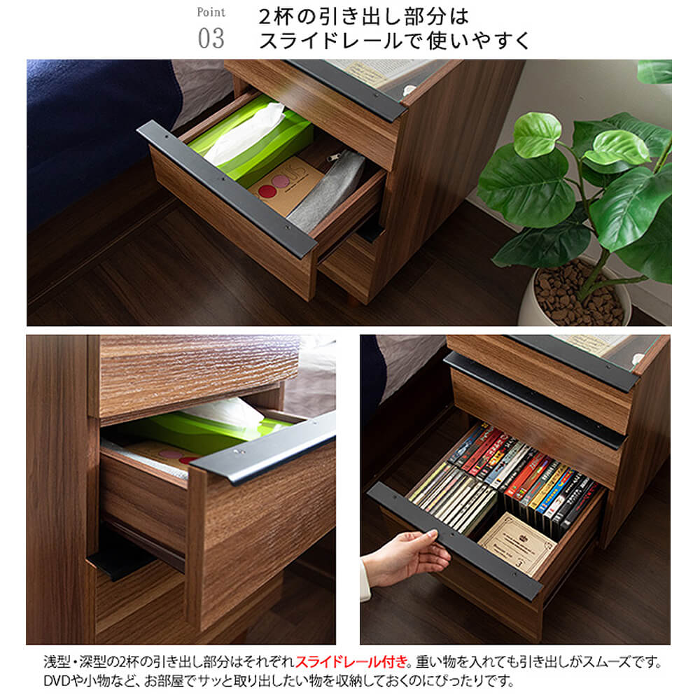 深さの違うラックやスライドレール付きの引き出し2杯で小さい見た目ながらたっぷりと収納できます。