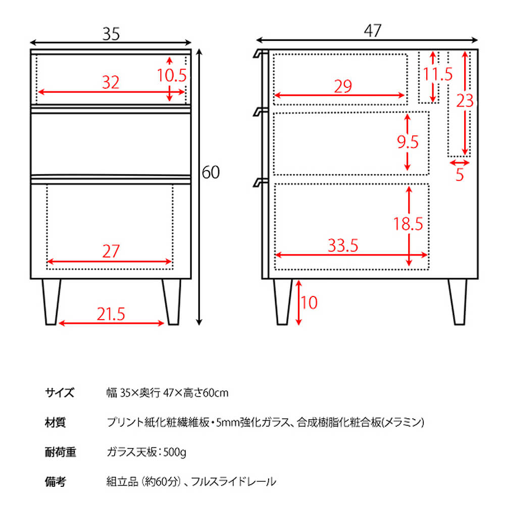 | サイズ(約) | サイズ:幅 35cm × 奥行 47cm × 高さ 60cm 耐荷重:ガラス天板:500g |