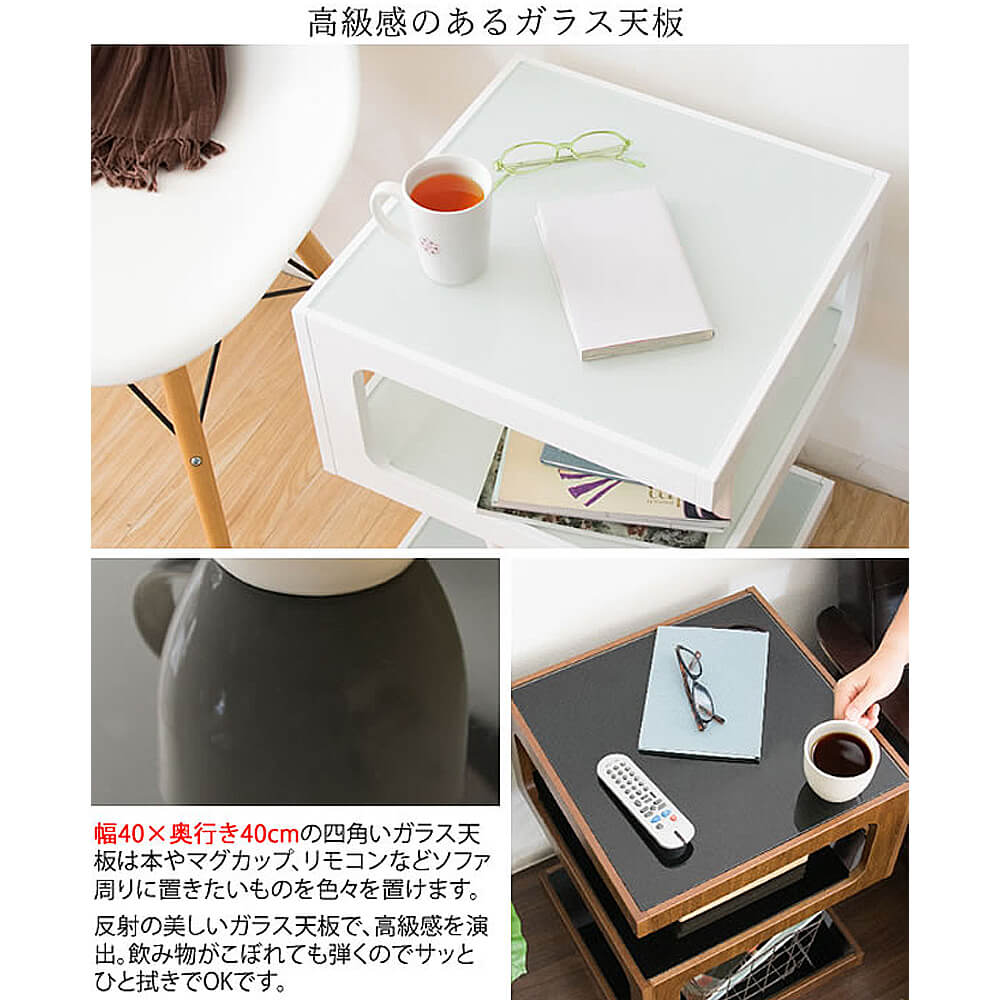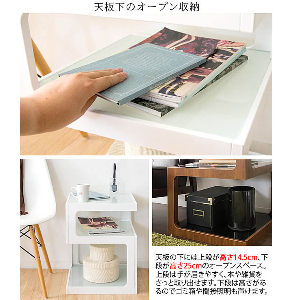 天板の下はガラス板のおしゃれなオープンスペースが2段あり、雑誌や新聞、高さのあるものも分けて収納できます。