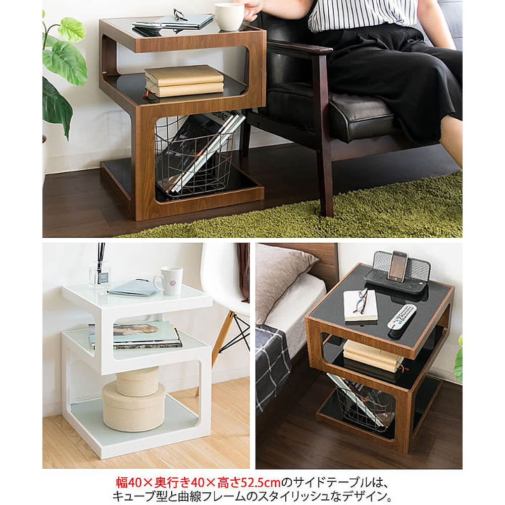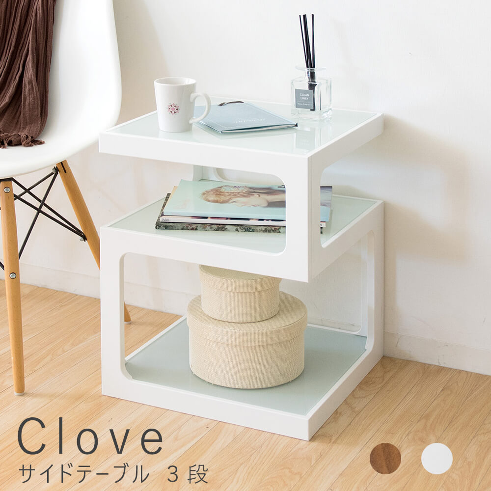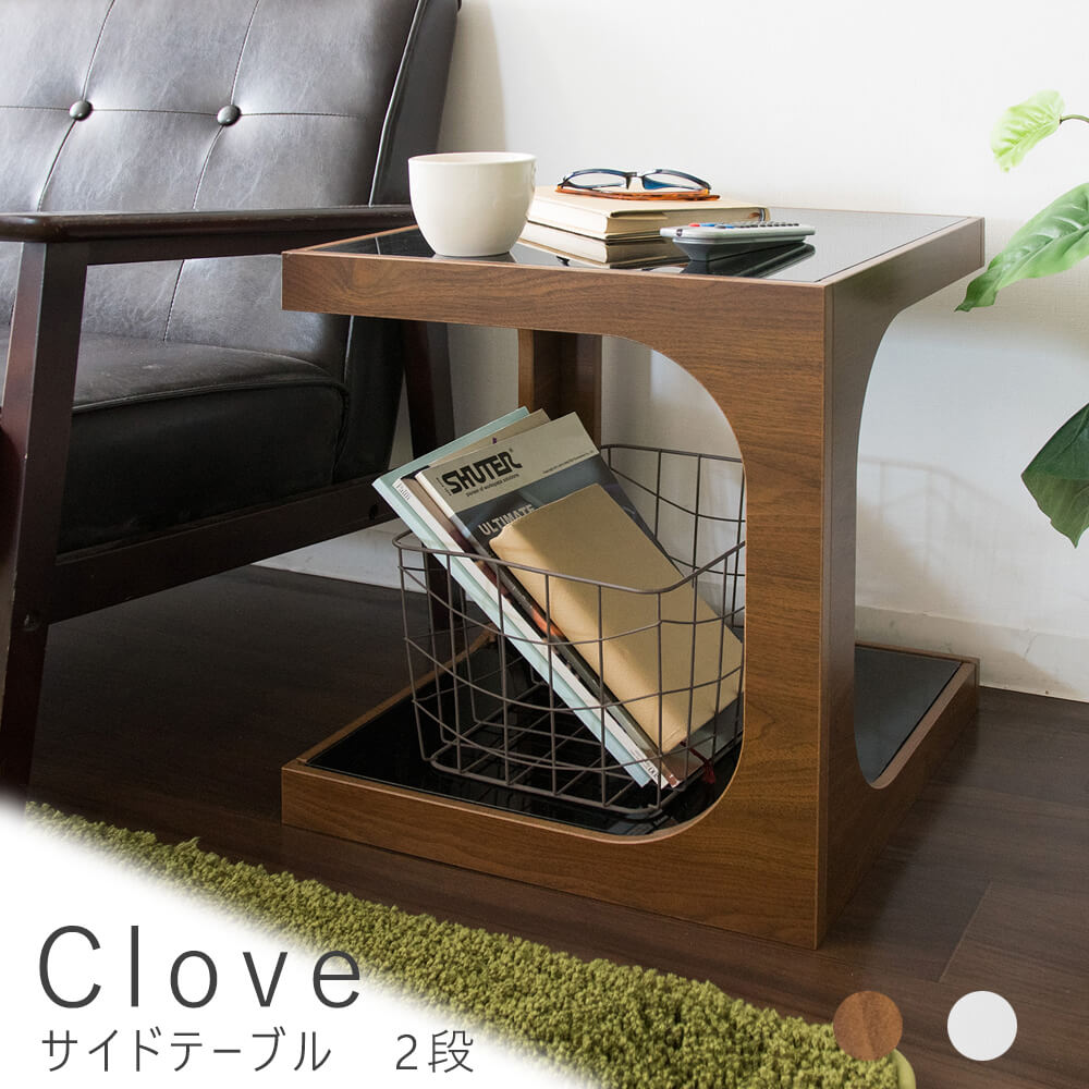 四角いキューブ型をくり抜いたようなスタイリッシュなガラス天板と木製フレームのサイドテーブル『Clove(クローブ)』。