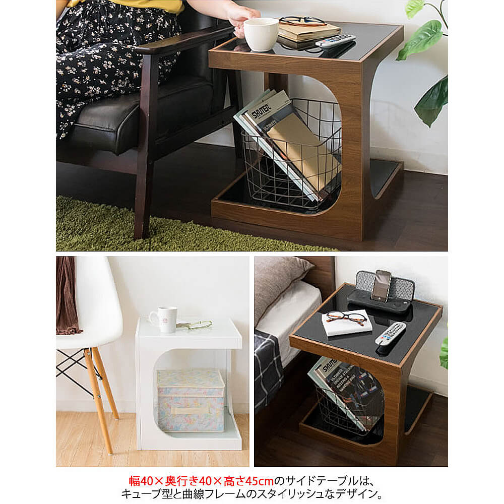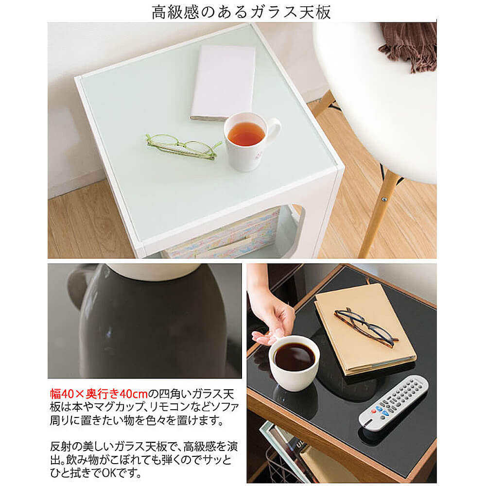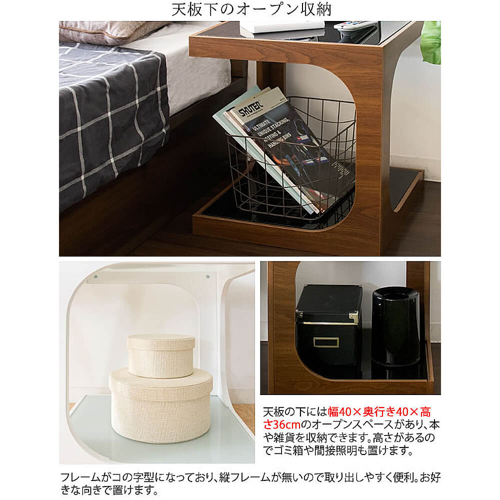 ソファやベッドサイドでちょっとした物を置くのに最適。天板の下はガラス板のおしゃれなオープンスペース。高さのあるものも収納できます。