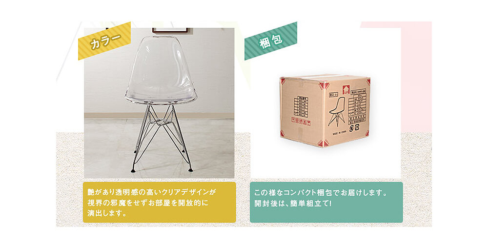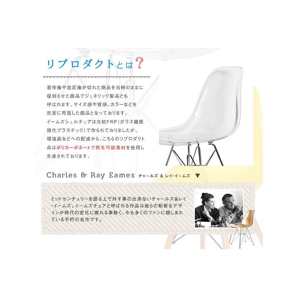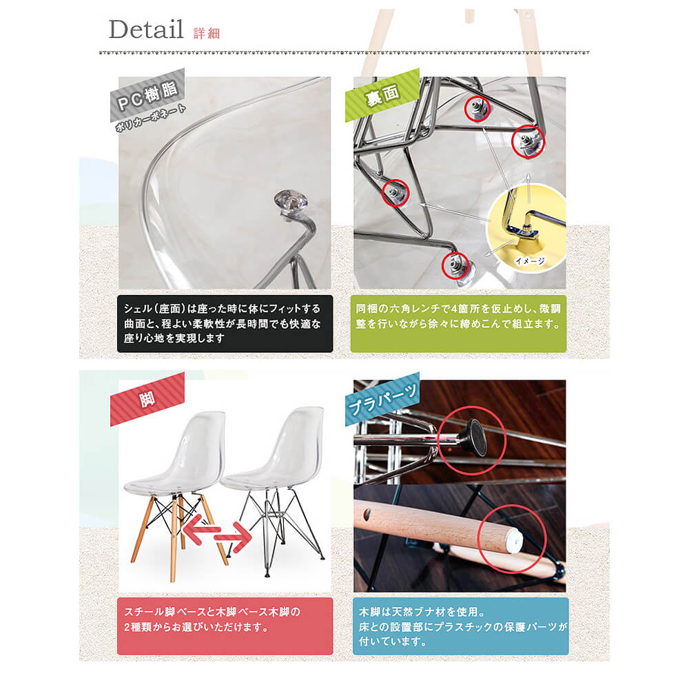 | 素材 | ■ スチール脚 脚素材:クロームメッキスチール シート素材:ポリカーボネート ■ 木脚 脚素材:ブナ無垢材・スチールブラック塗装 シート素材:ポリカーボネート |