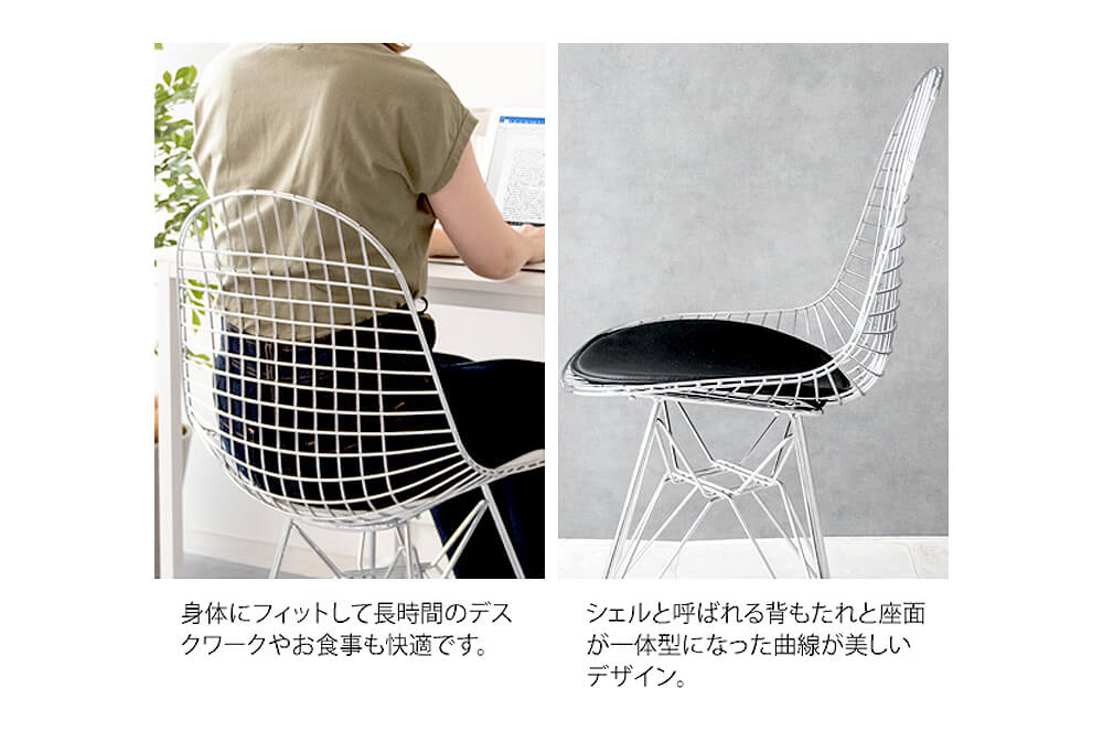 身体を包み込むシェルデザインの座面は、スチールのワイヤーが網目状に構成されており耐久性に優れています。