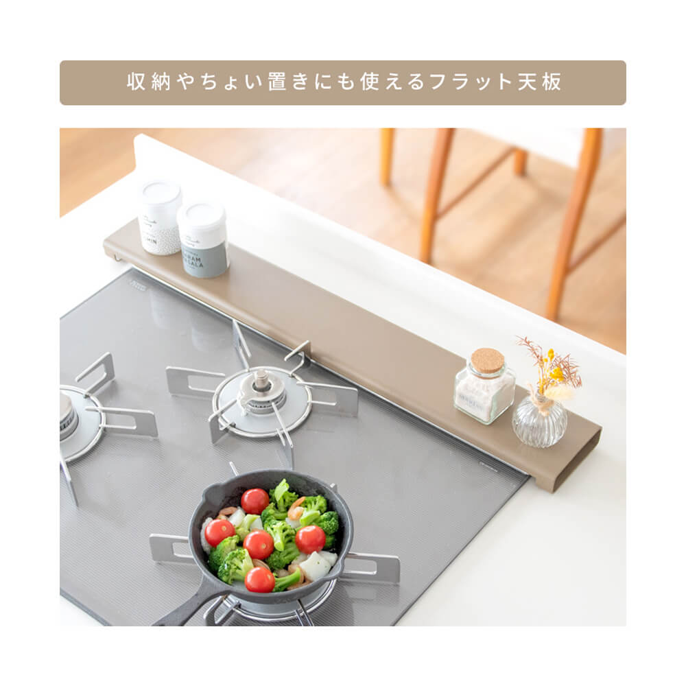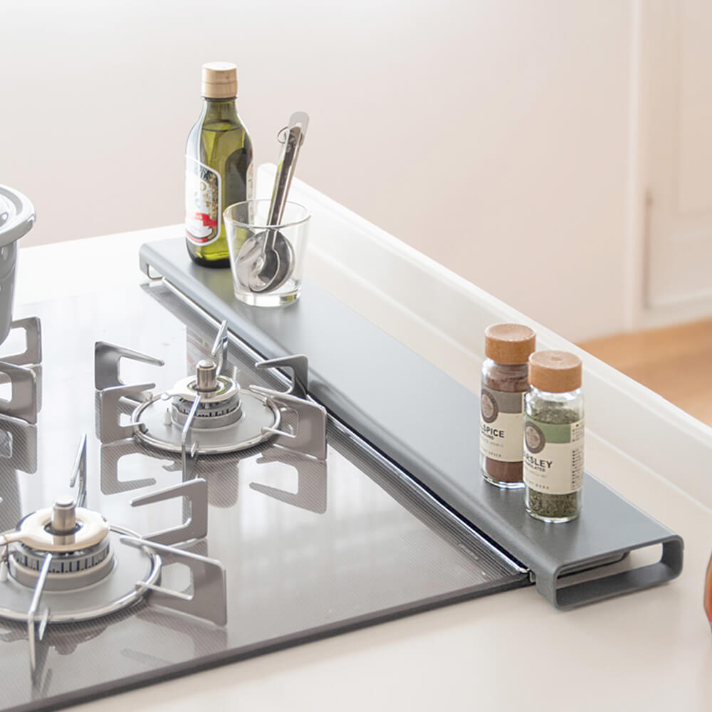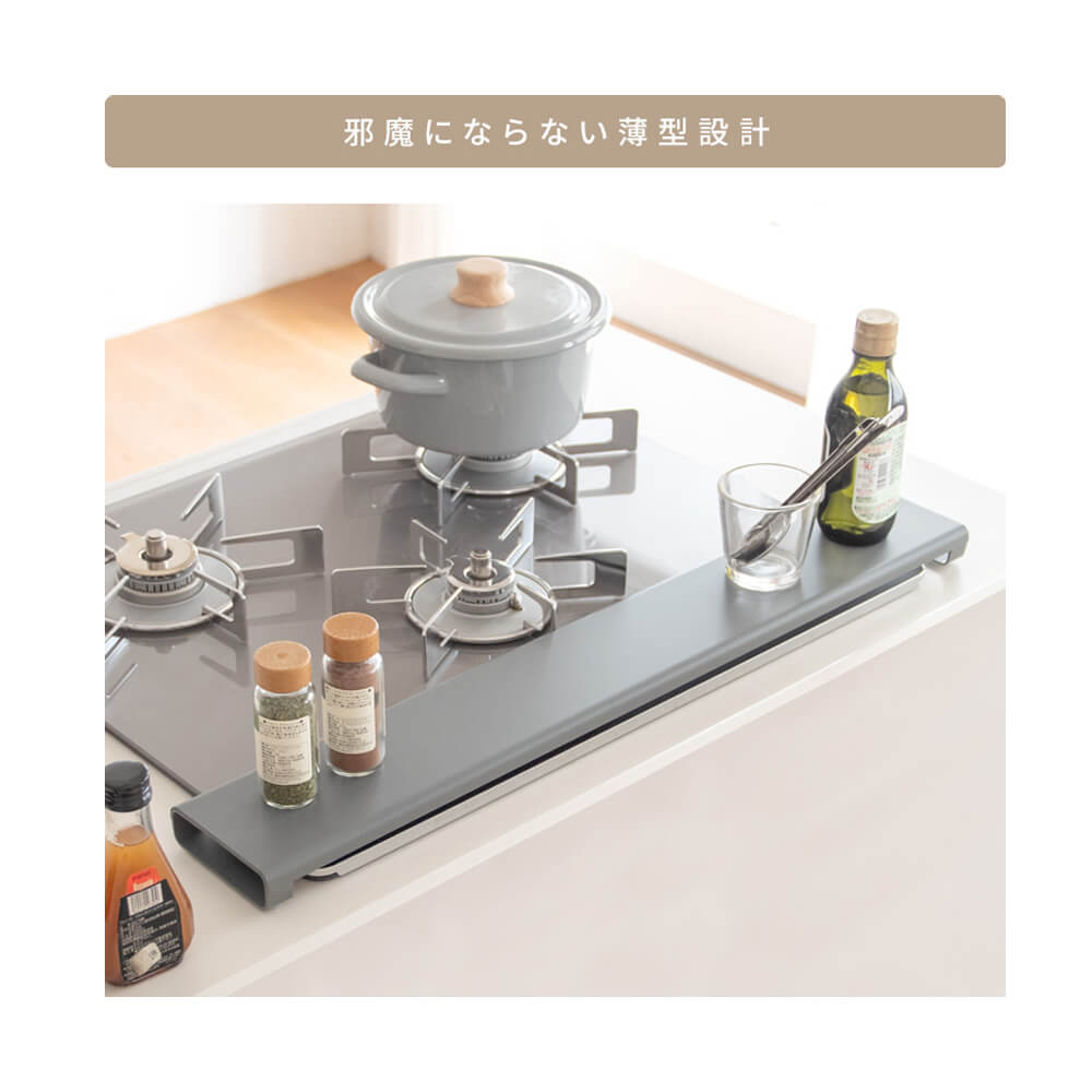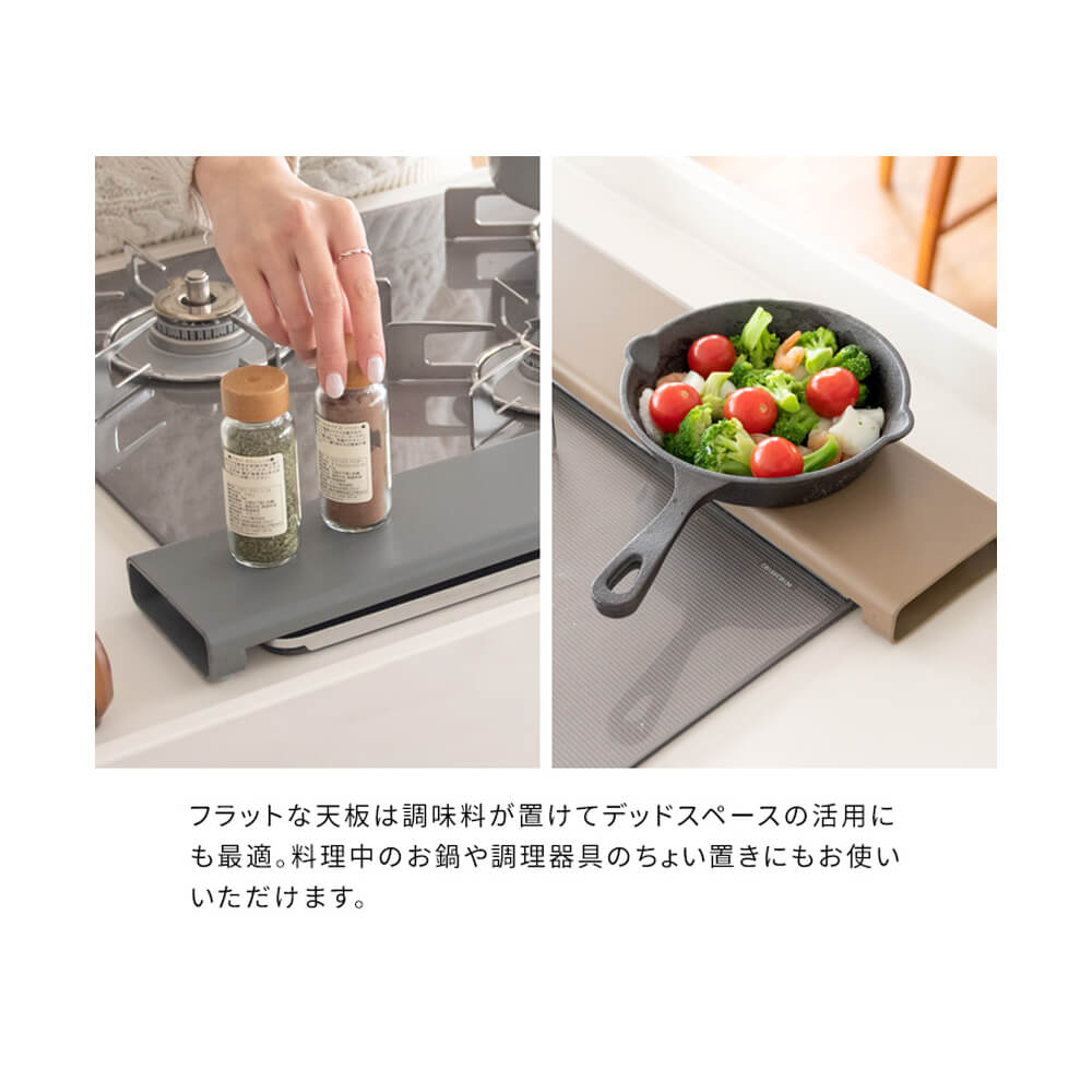 フラットなカバーで天板に調味料収納やお鍋のちょい置きにお使いいただけます。薄型で奥のコンロの邪魔にもなりません。