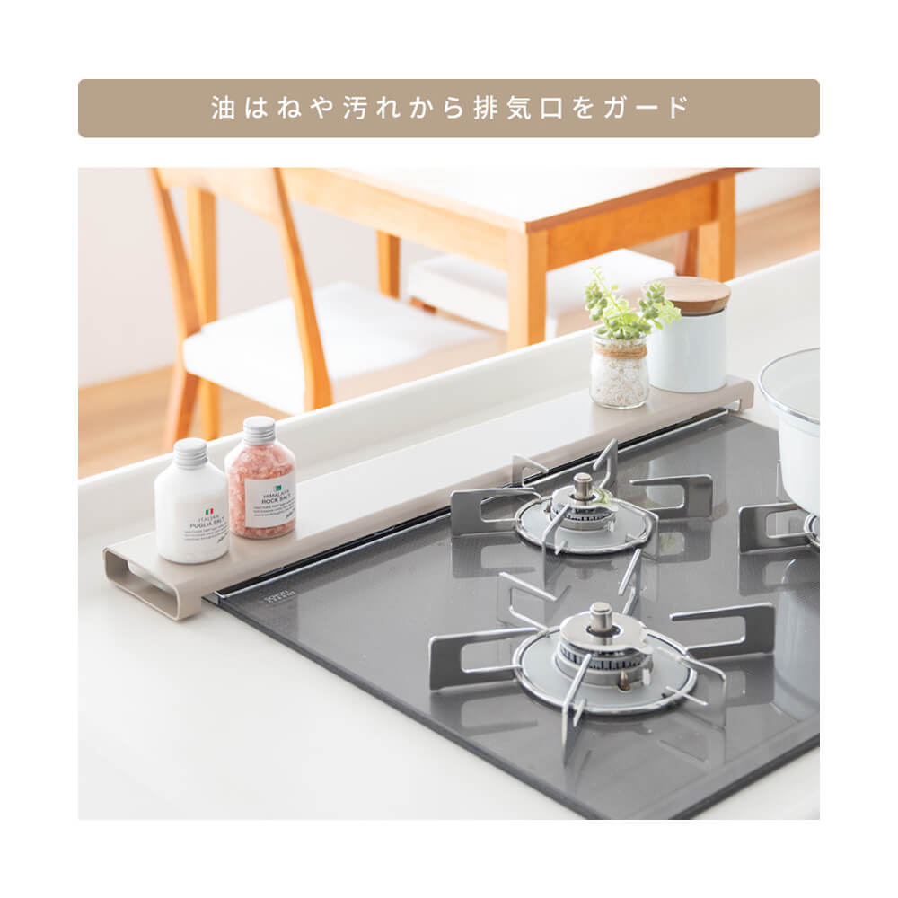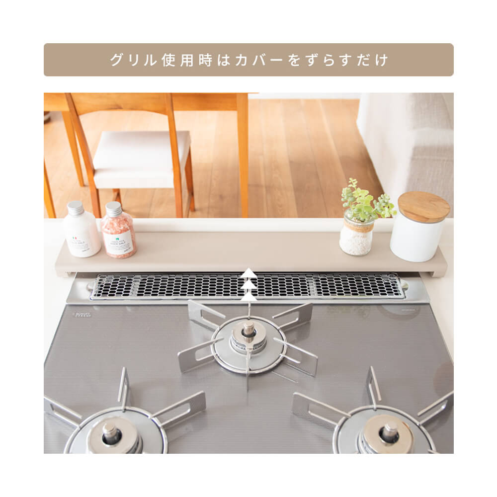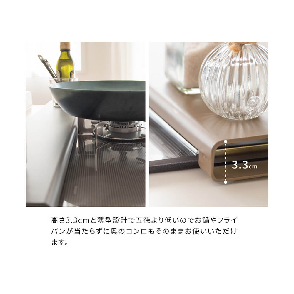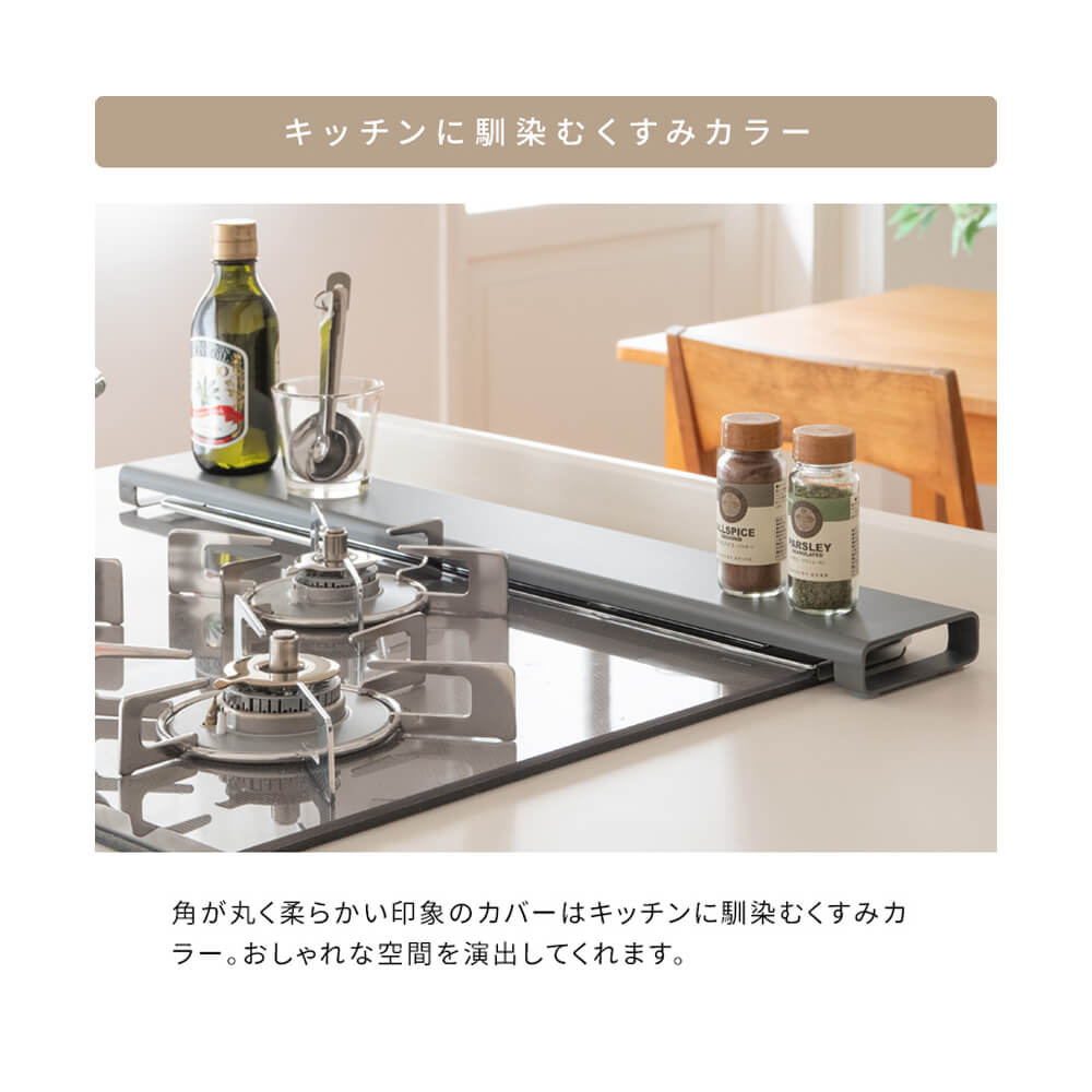 フラットなカバーで天板に調味料収納やお鍋のちょい置きにお使いいただけます。薄型で奥のコンロの邪魔にもなりません。
