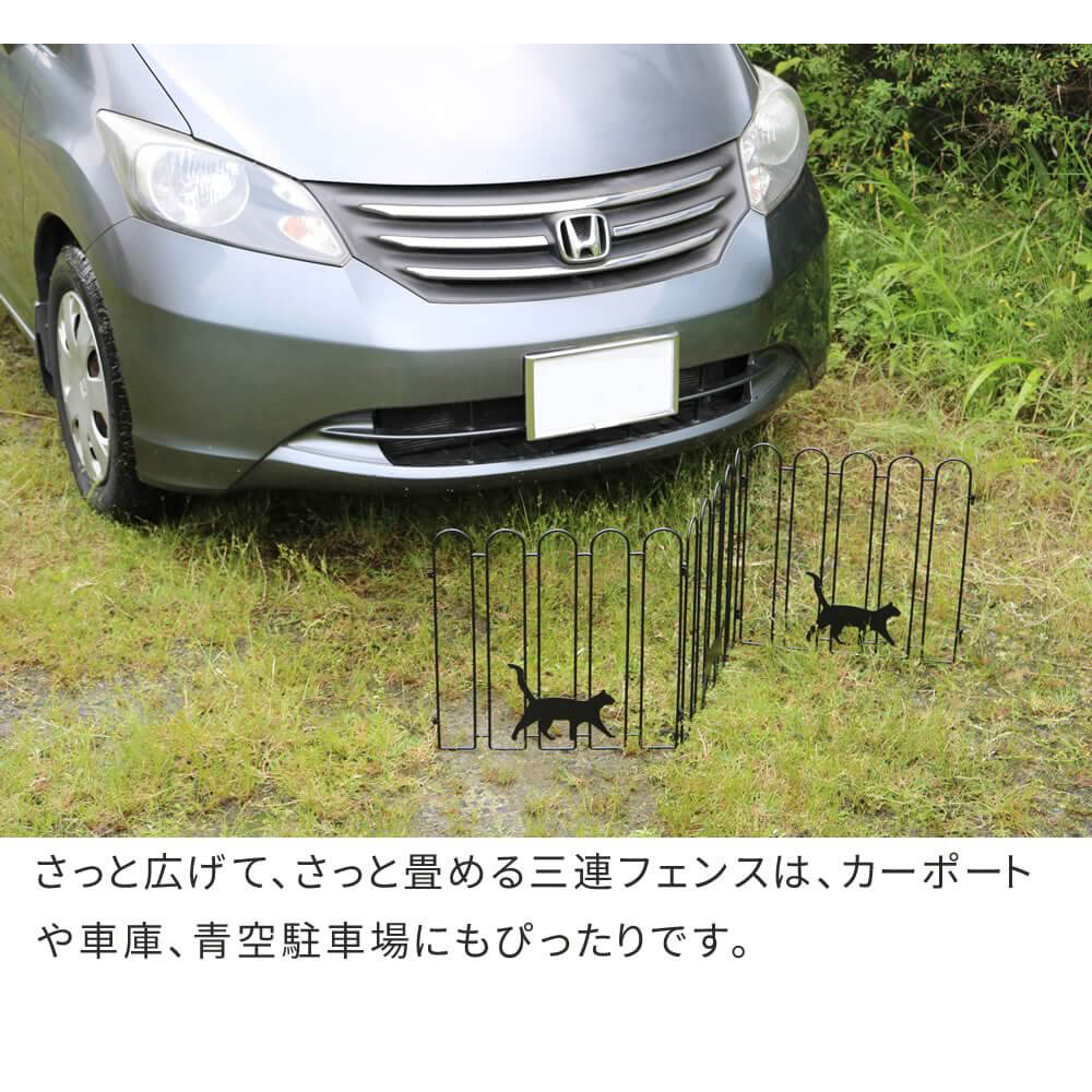 三連フェンスはさっと広げて、さっと畳むことができ、ガーデンやカーポート、車庫、青空駐車場など、様々な場所にフレキシブルに対応します。