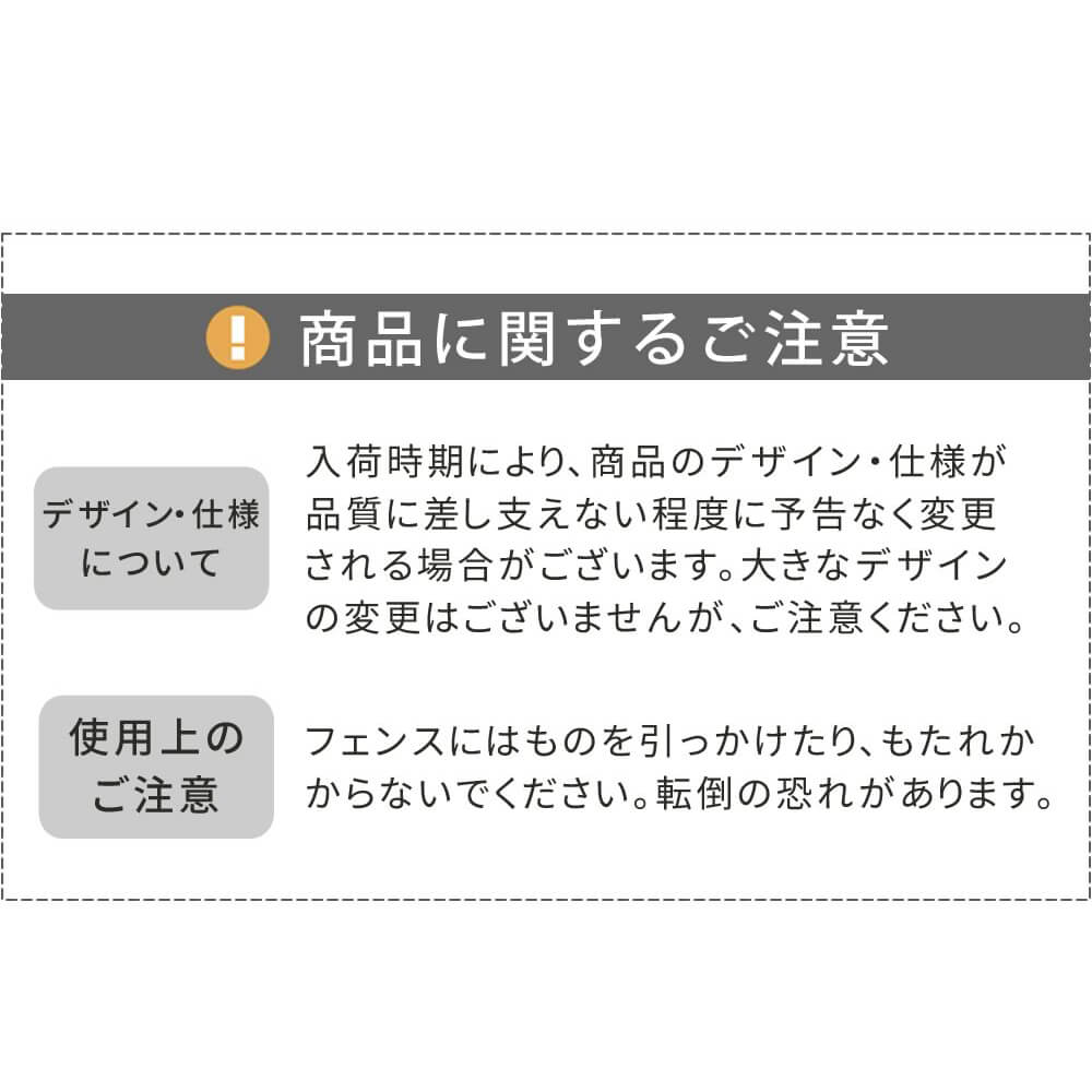 | 備考 | 完成品 ※蝶番の仕様上、直角(90度)に曲がるのは片側だけになります。1枚のフェンスでは「コ」の字型にはできません。 ※2枚以上連結すれば、「コ」の字型や四角形を作ることができます。 ※商品の色味に関してましては、できる限り実物に近くなる様に努めておりますが、ご利用のモニターやデバイスの発色によりまして、実物と異なって見える場合がございます。 ※商品の色味に関してましては、できる限り実物に近くなる様に努めておりますが、ご利用のモニターやデバイスの発色によりまして、実物と異なって見える場合がございます。 |