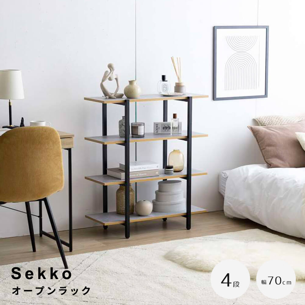 ヴィンテージの温もりとストーンの質感のおしゃれな4段オープンラックで、空間に深みと個性をプラス。