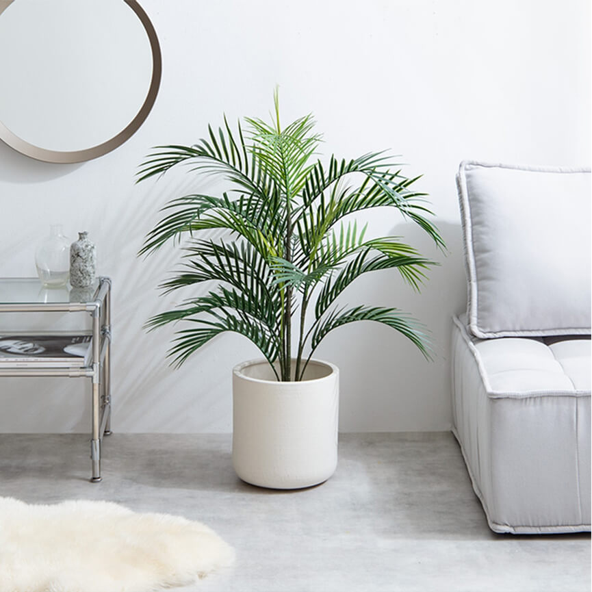涼しげな光沢感ある細長い葉が印象的な南国の雰囲気漂うアレカヤシ。ヤシ科の中でもインテリアグリーンに最適と言われており大人気です。モダンからトレンド感のあるお部屋まで幅広いテイストに馴染み、お部屋をワンランク上の空間へと導きます。