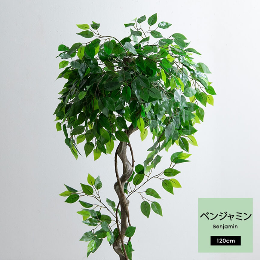 小さな葉がボリュームいっぱい茂る、存在感抜群のベンジャミン。艶やかなグリーンとライトグリーンが入り混じる葉はお部屋に明るさをもたらします。また、螺旋を描くような造形の幹もアクセントとなるポイントです。