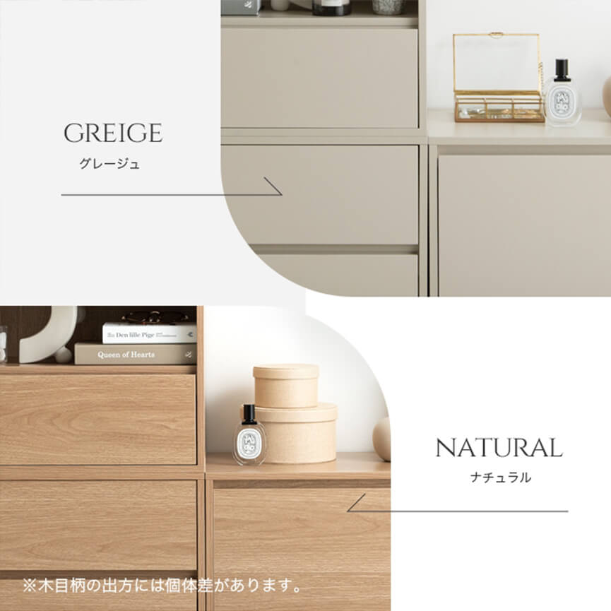 カラーは、温かみのある自然な木目柄がお部屋に馴染みやすい「ナチュラル」と、上品な印象でお部屋を上質な空間に引き上げる「グレージュ」の2色をご用意。ご自宅の空間に合うぴったりのカラーをお選びください。