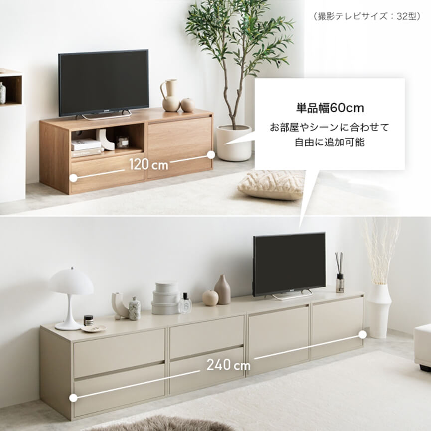 幅は単品60cmで、お持ちのテレビサイズやお部屋の大きさに合わせて気軽に追加可能。テレビの買い替えやお引越しの時も柔軟にカスタムできるので、末永くご使用いただけます。