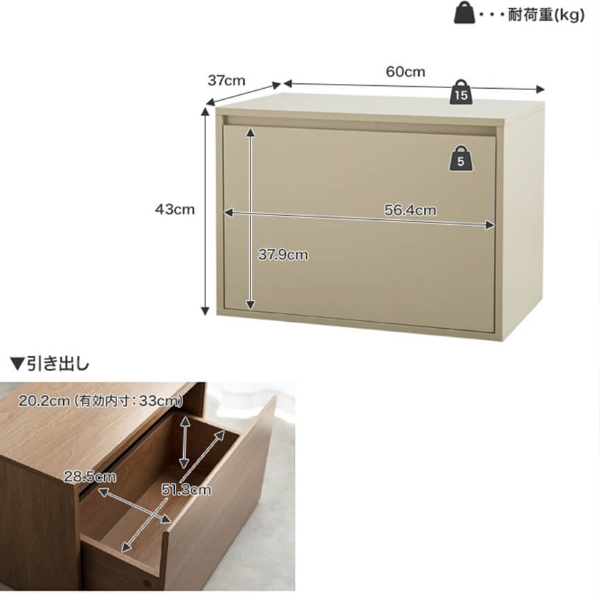 | サイズ(約) | サイズ:幅60cm×奥行37cm×高さ43cm 商品重量:約13kg 耐荷重:天板:約15kg 、引き出し:各約5kg |
