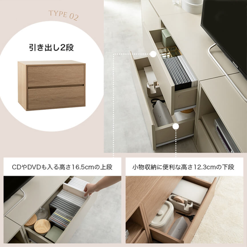 CDやDVDなどもすっきり収納できる引き出し2段