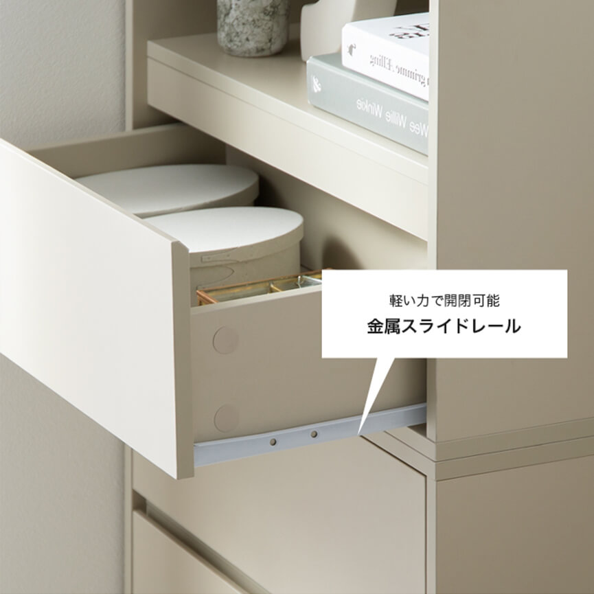 引き出しは全て丈夫な金属製のスライドレールでスムーズに開閉でき、重みが増した引き出しでも軽い力で開閉が可能。また、ストッパー付きのため手前にしっかり引き出しても外れることがなく、奥に入れたものも楽に取り出していただけます。