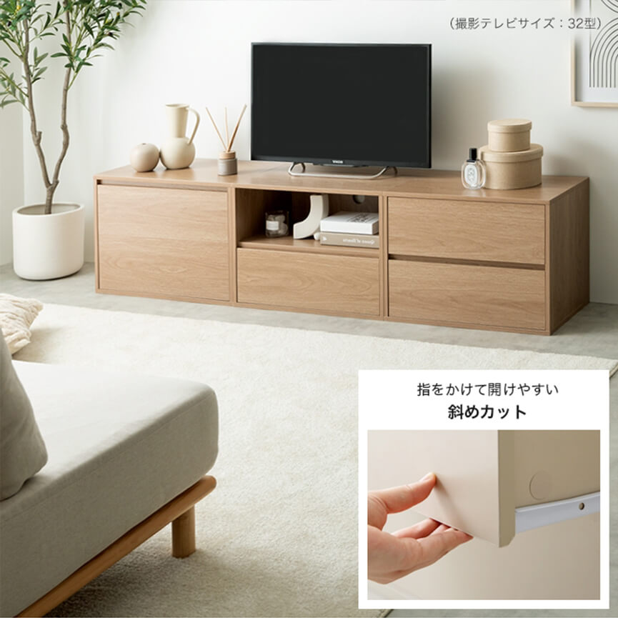 取っ手や余計な装飾を省いた直線的なノイズレスデザインは、幅広いテイストのお部屋に溶け込み、すっきりした印象を与えます。また、引き出しの前面は内側に斜めカットを施すことで、指を引っかけて簡単に開閉できる構造に。デザインをシンプルに仕上げつつ使用感にもこだわりました。