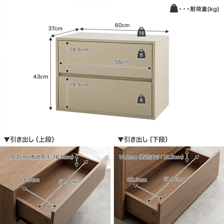 | サイズ(約) | サイズ:幅60cm×奥行37cm×高さ43cm 商品重量:約16kg 耐荷重:天板:約15kg 、引き出し:各約5kg |
