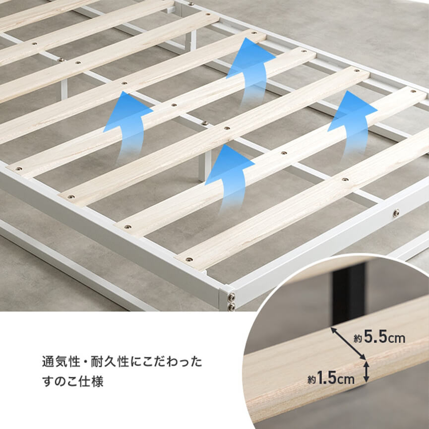 床板は通気性の良いすのこ仕様。敷布団やマットレス下の湿気を逃がし、季節問わず爽やかな寝心地が感じられます。また、すのこの厚みは耐久性に優れた1.5cmで、丈夫さにもこだわりました。