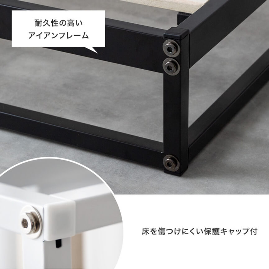 通気性に優れたすのこ仕様で、敷布団やマットレス下の湿気をしっかり逃がし、一年中爽やかで快適な寝心地を提供します。ベッド中央には3本のサポート脚と桟板で補強されており、たわみを低減し安定感を確保。さらに、耐久性の高いアイアンフレームは、錆びにくい粉体塗装加工で長く愛用できます。