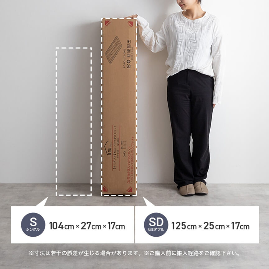 梱包サイズはセミダブルでも約125cm×約25cm×約17cmと非常にコンパクト。狭い支間や廊下でもラクラク持ち運ぶことができるので、購入の際にサイズを心配されている方も安心です。