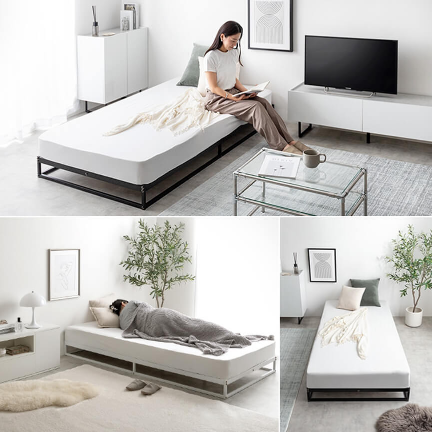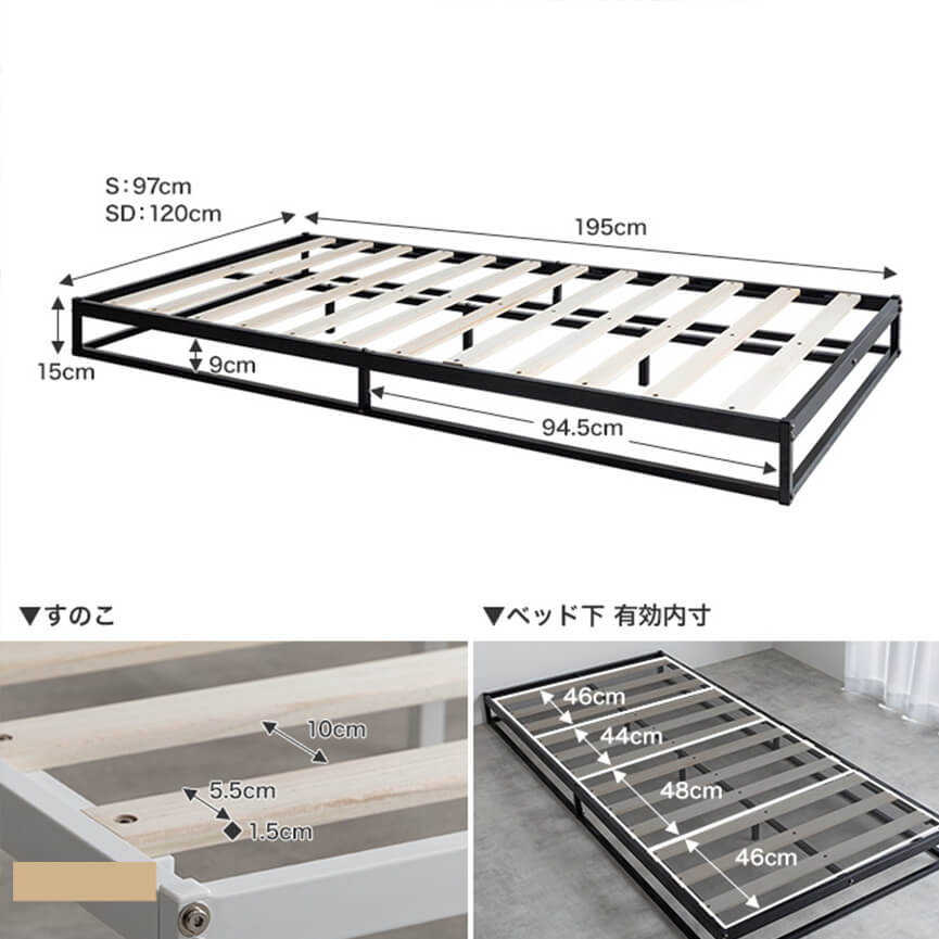 高さ15cmのロータイプ設計で、お部屋を広々と見せることができ、特にワンルームや一人暮らしに最適です。ブラックカラーはモダン・インダストリアルなテイストに、ホワイトカラーは北欧・ナチュラルスタイルのお部屋にぴったりで、どんな空間にも調和します。