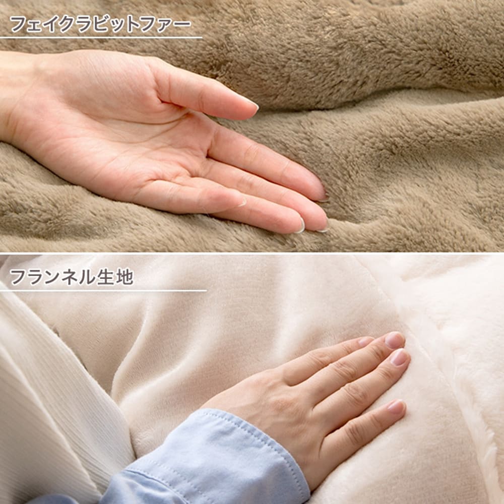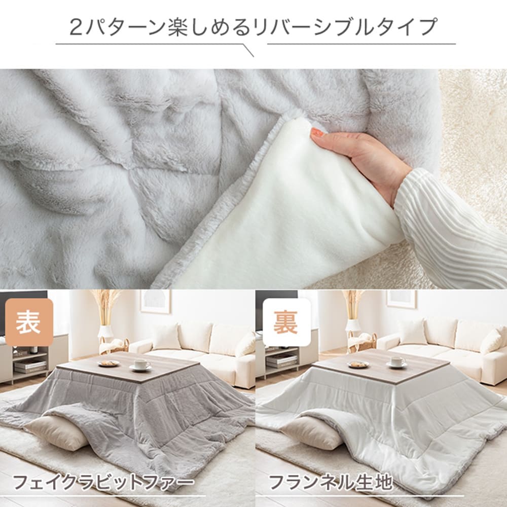 さらに、肌触りが抜群のこたつ布団はリバーシブル仕様になっており、表はふんわりとしたフェイクラビットファー、裏は柔らかなフランネル生地を使用。