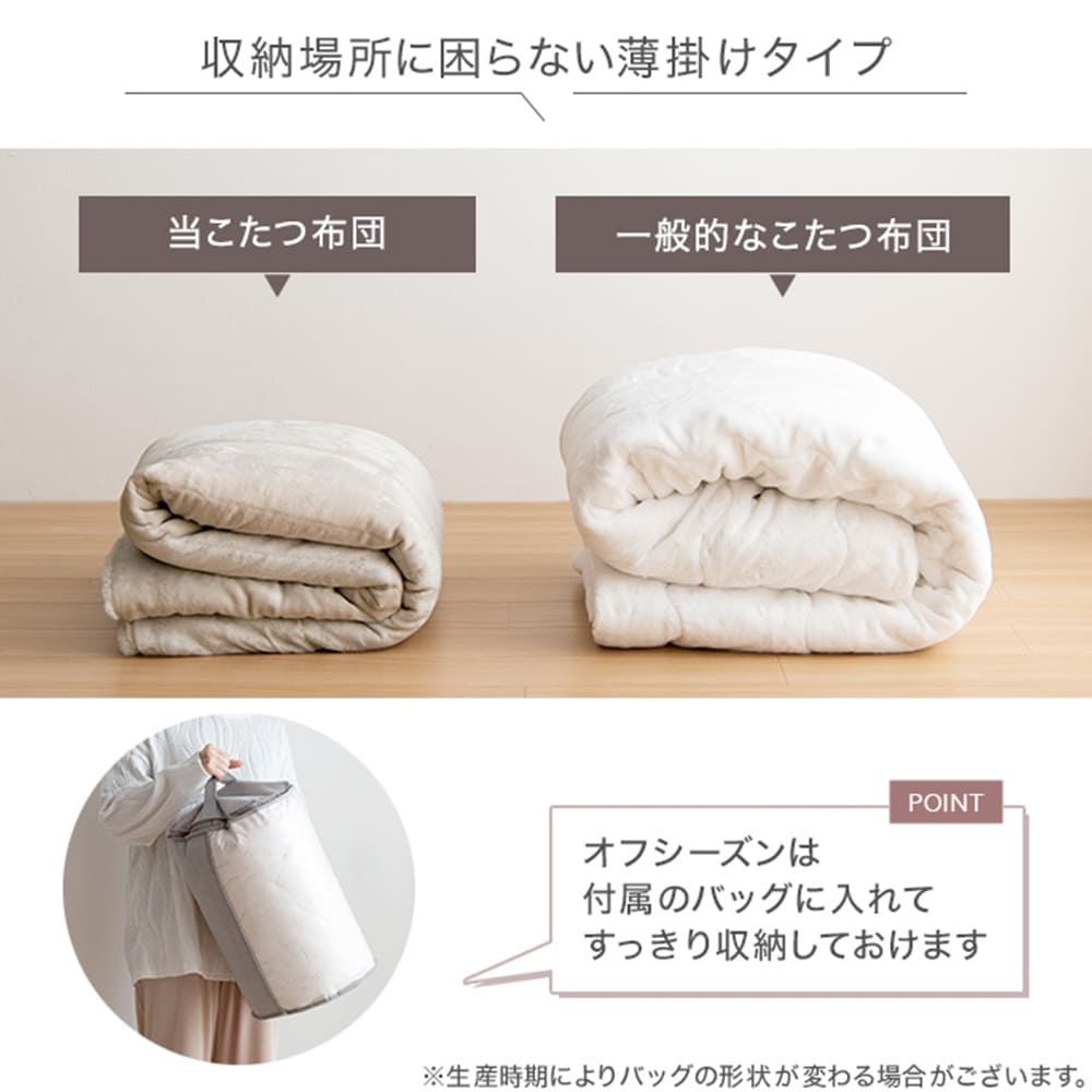 布団は薄手設計でかさばらず、使わない季節にはコンパクトに収納でき、付属の収納バッグに入れてスッキリ保管が可能なのも嬉しいポイントですね。