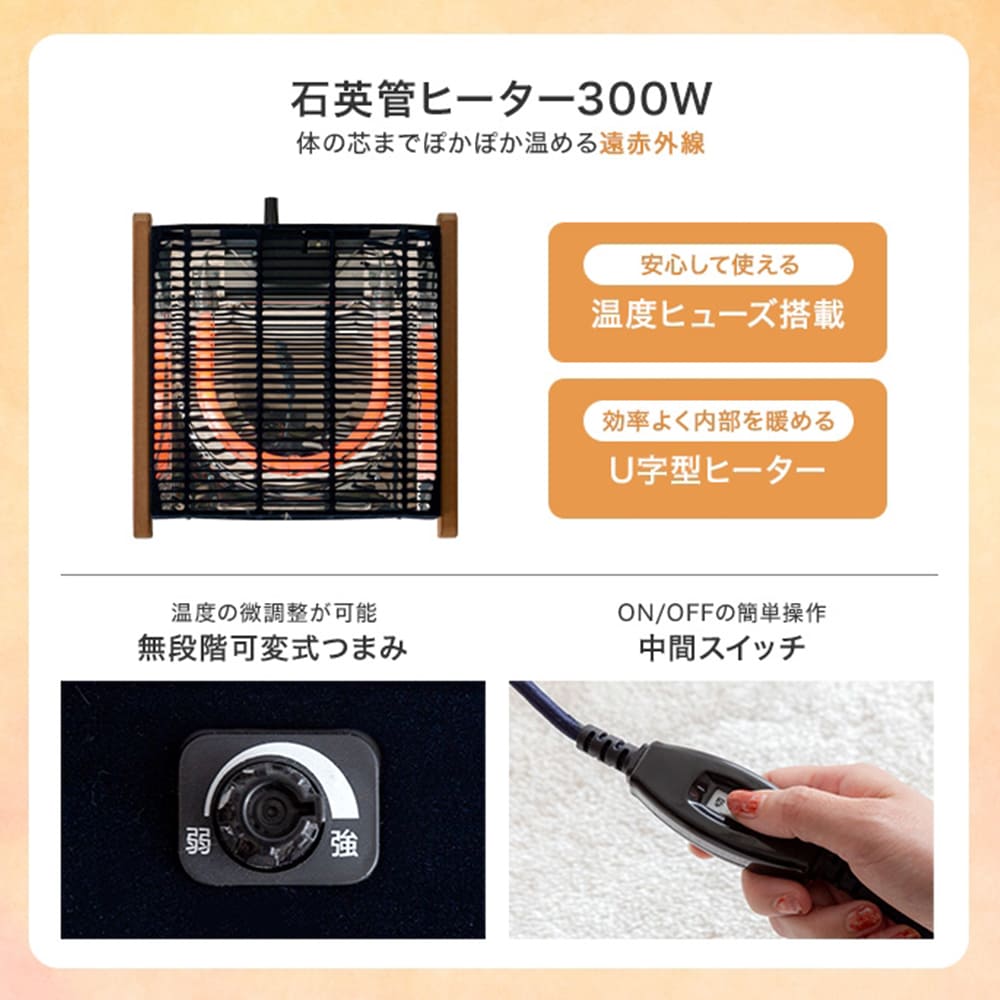 また、300Wの遠赤外線ヒーターを内蔵しており、じんわりと体の芯から温めてくれるので、エアコンよりも電気代を節約しながら暖かな時間をお過ごしいただけます。