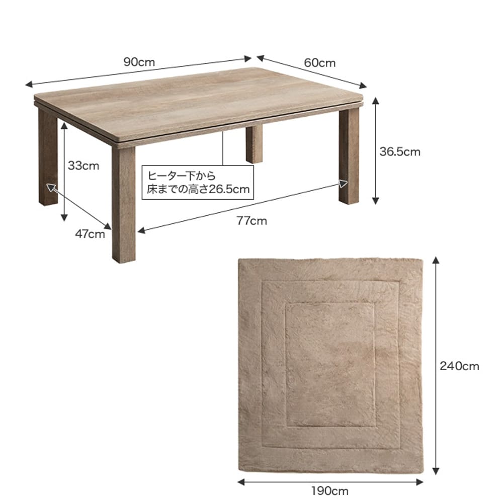 | サイズ(約) | ■ 本体サイズ テーブル: 幅 90cm × 奥行 60cm × 高さ 36.5cm 布団: 190cm × 240cm ■ 商品重量 テーブル: 約 12.5kg 布団: 約 3.7kg ■ 耐荷重 テーブル: 天板 約10kg |