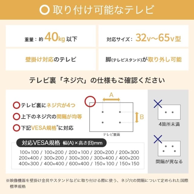 32v~65vまでの幅広いテレビサイズに対応。本体耐荷重は約40kgと安心してお使いいただけます。お手持ちのテレビの重さをご確認ください。