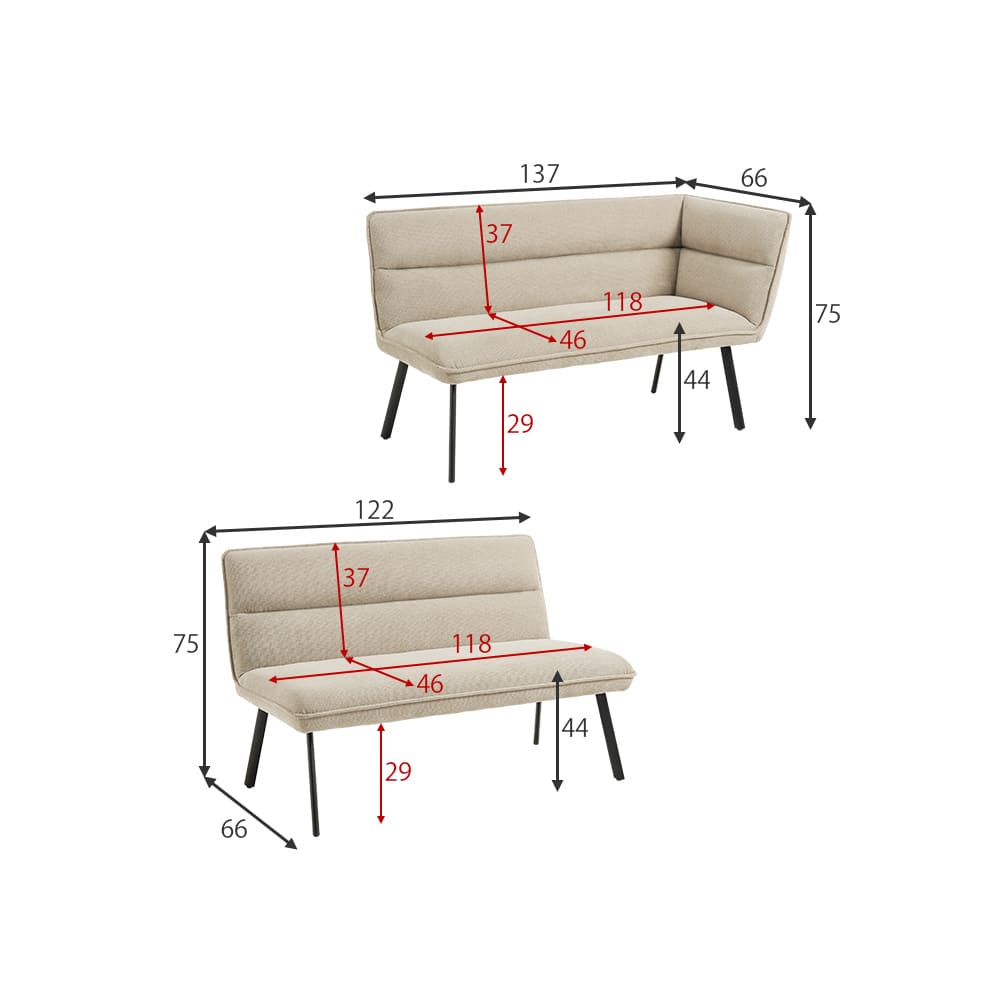 | サイズ(約) | 片肘 :(約) 幅 137cm × 奥行 66cm × 高さ 75cm × 座面高 44cm 肘なし :(約) 幅 122cm × 奥行 66cm × 高さ 75cm × 座面高 44cm |