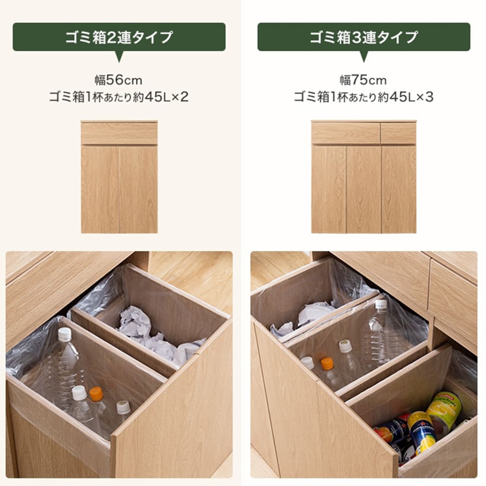 生活感を隠しながら、ゴミ箱1杯あたり45Lの大容量を確保し、生ゴミやプラスチックなどの分別がラクに行えます。