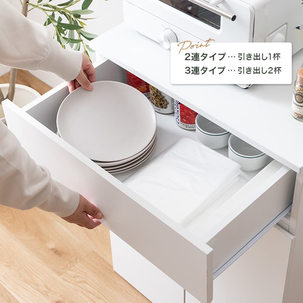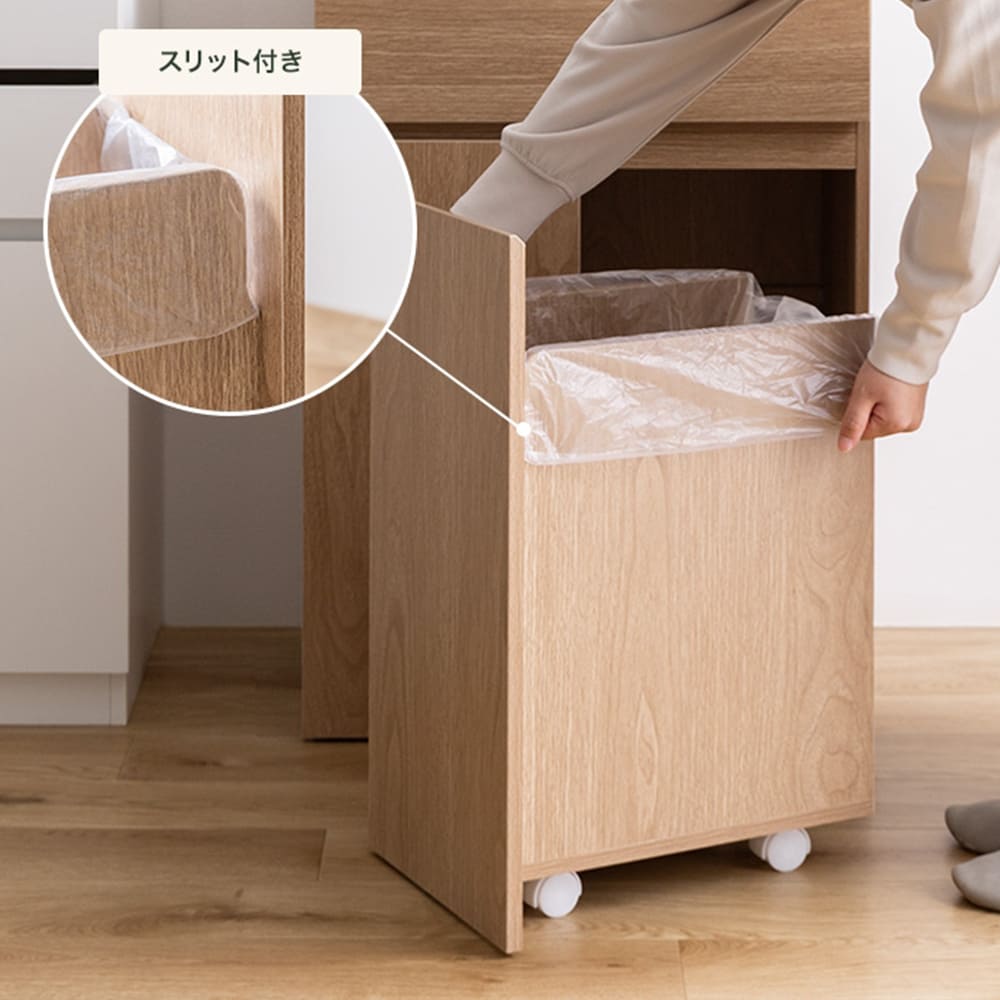 用途に合わせて選べる2連タイプと3連タイプの2種類をご用意し、忙しい日々のゴミ捨てがより快適に。引き出しにはスリット付きでゴミ袋のセットも簡単に行えます。