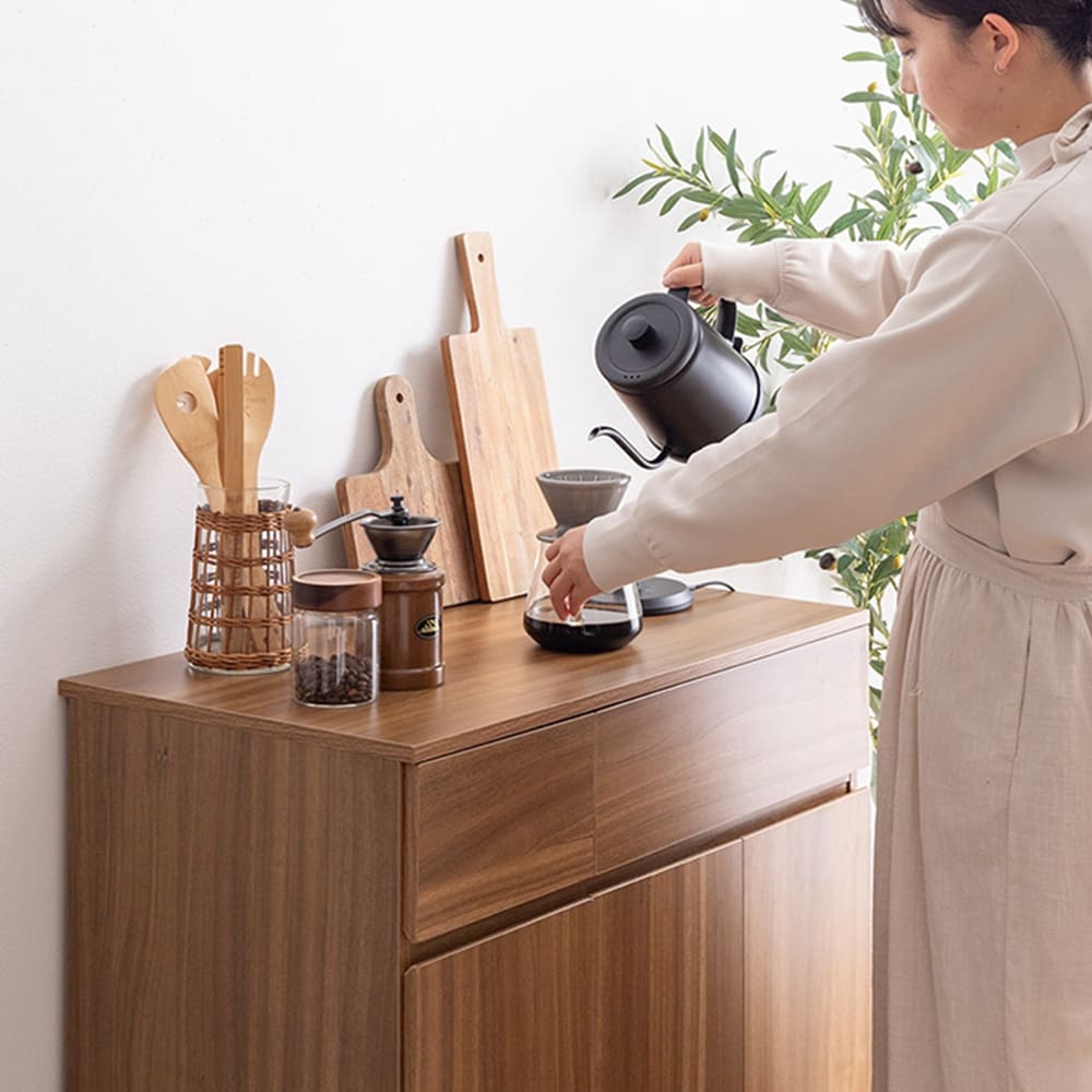 また、コードスリット付きの天板は調理中の家電を置いたり、作業スペースとしても活用可能。