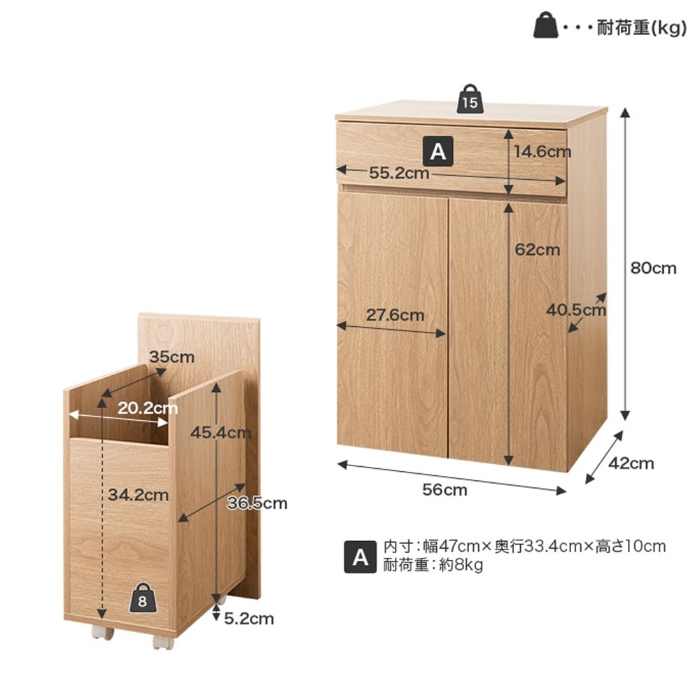 | サイズ(約) | 本体サイズ: 幅 56cm × 奥行 42cm × 高さ 80cm 商品重量: 約30.9kg 耐荷重: 天板 約15kg 、引き出し 約8kg、ゴミ箱底板(各) 約8kg |