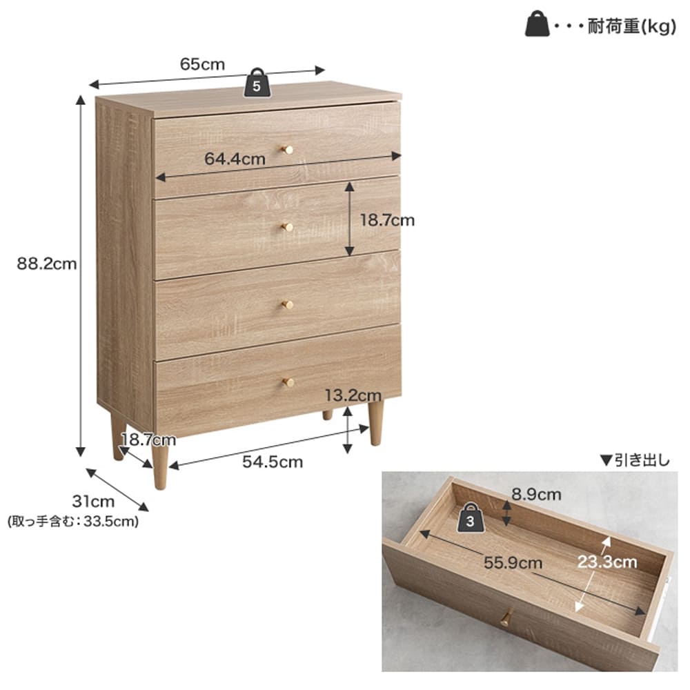 | サイズ(約) | 本体サイズ: 幅 65cm × 奥行 31cm × 高さ 88.2cm 商品重量: 約 29.6kg 耐荷重: 天板 約5kg 、引き出し 各 約 3kg |