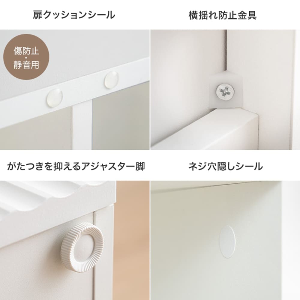 可動棚4枚付きの扉収納は、高さの異なるアイテムにも柔軟に対応し、背面のコード穴でルーター類も美しく収納可能。