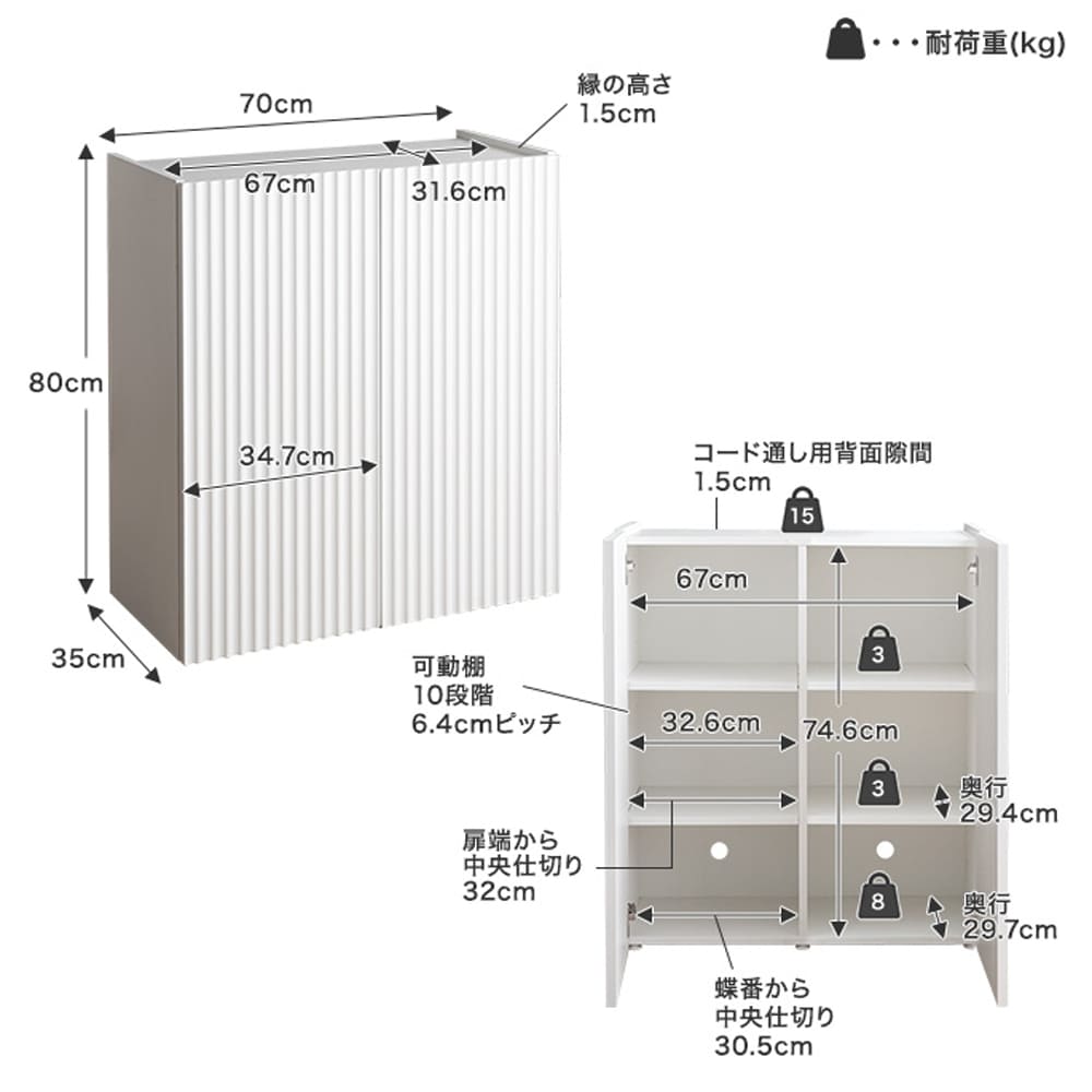 | サイズ(約) | 本体サイズ: 幅 70cm × 奥行 35cm × 高さ 80cm 商品重量: 約 25.7kg 耐荷重: 天板 15kg、可動棚(各) 約3kg、底板 約8kg |