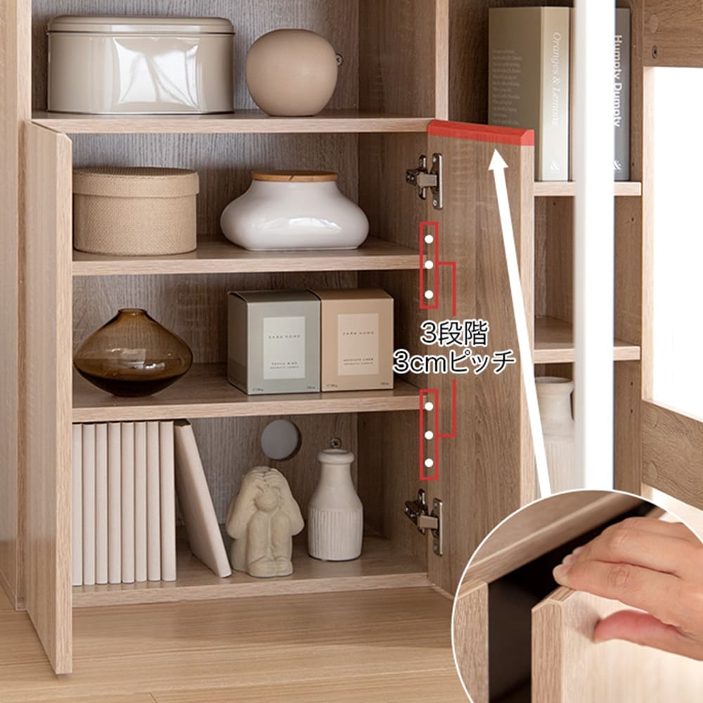 収納は扉付きとオープン棚の2種類で、見せる収納と隠す収納の使い分けが可能。