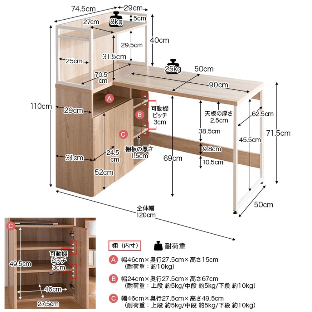 | サイズ(約) | 本体サイズ: 幅 120cm × 奥行 74.5cm × 高さ 110cm 商品重量: 約 38.5kg 耐荷重: 天板 約25kg、棚(最上段) 約8kg、棚(天板下) 約10kg、扉収納(可動棚) 約5kg、扉収納(底板) 約10kg、オープン収納(可動棚) 約5kg、オープン収納(底板) 約10kg |