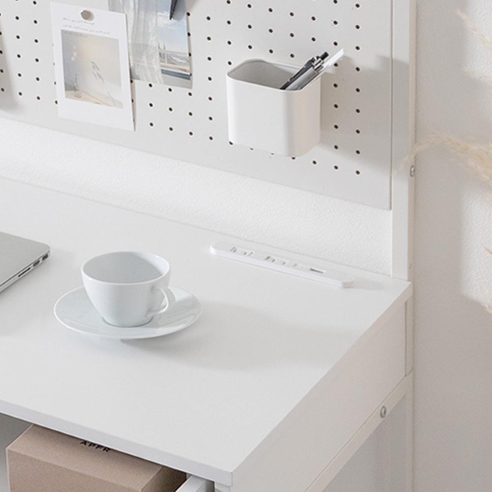 有孔ボード・引き出し・天板ラック・USB&2口コンセントまで揃った多機能デスク。