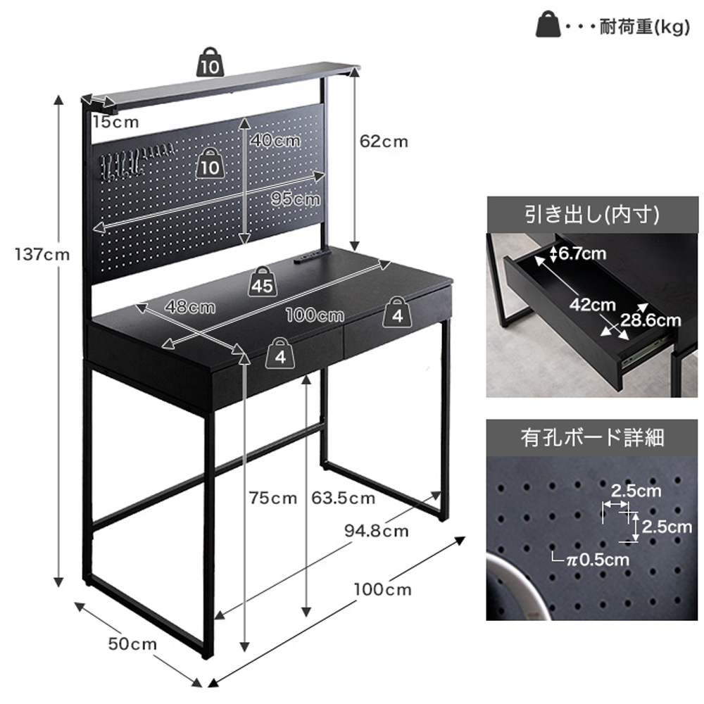 | サイズ(約) | 本体サイズ: 幅 100cm × 奥行 50cm × 高さ 137cm 商品重量: 約 19.7kg 耐荷重: 天板ラック 約10kg 、有孔ボード 約10kg、天板 約45kg、各引き出し 約5kg |