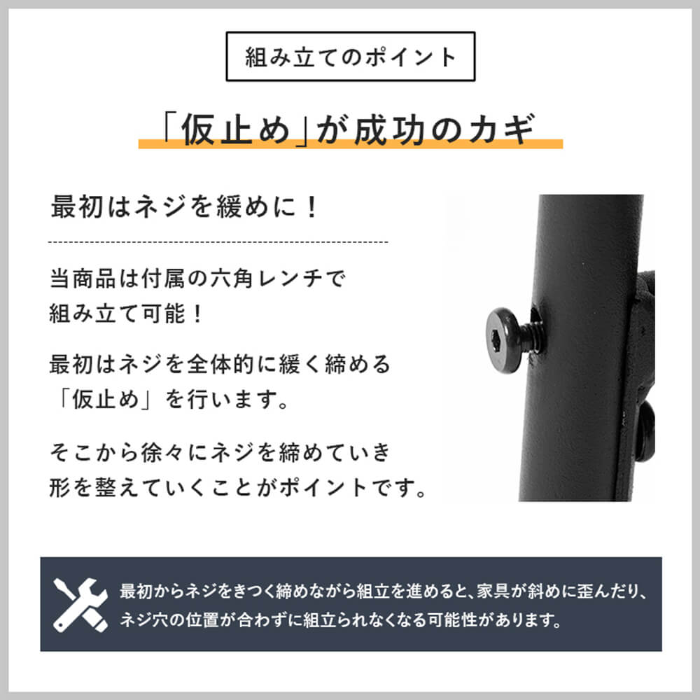 ※最初からネジをきつく締めながら組立を進めると、家具が斜めに歪んだり、ネジ穴の位置が合わずに組立られなくなる可能性があります。