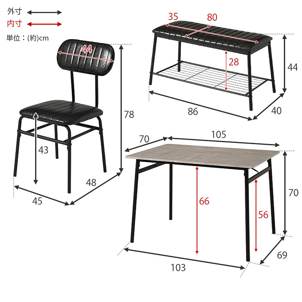 | 素材 | フレーム : スチール 天板 : 合成樹脂化粧繊維板(塩化ビニル) チェア・ベンチ張地 : 合成皮革 |