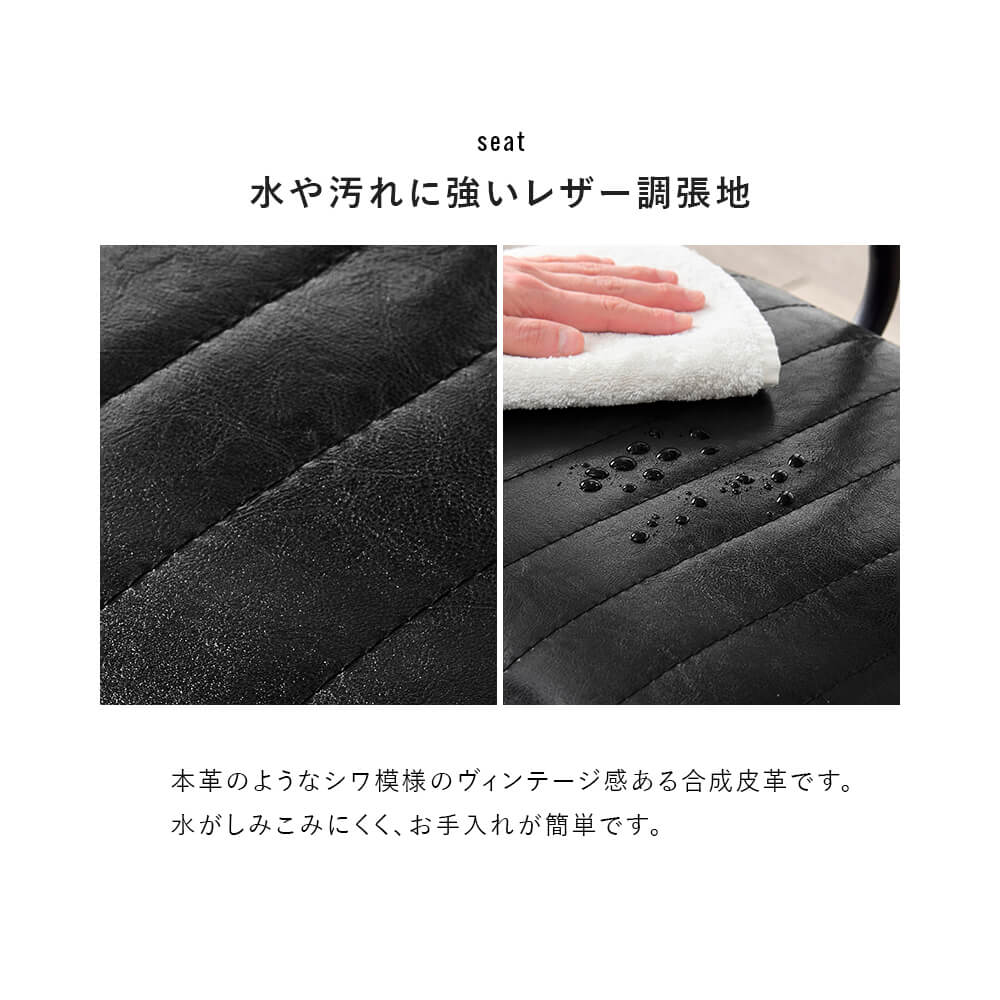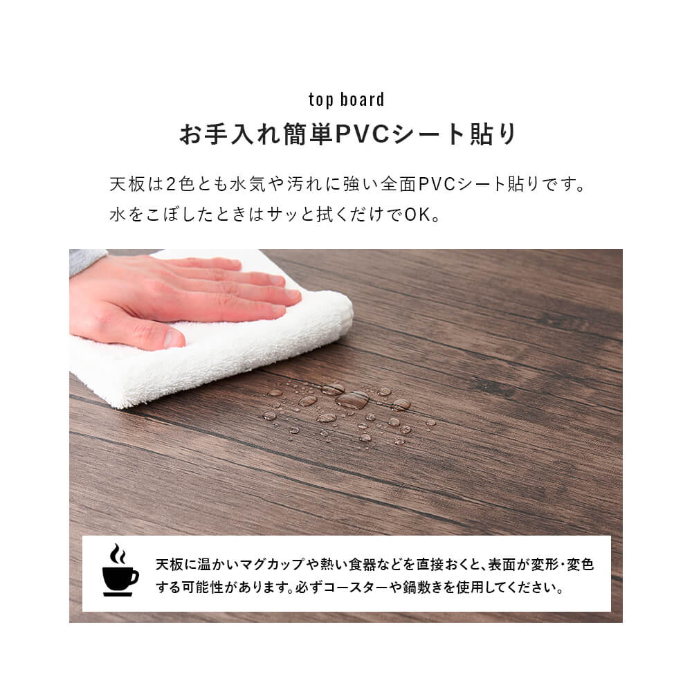 さらに、天板は全体がPVCシートで覆われており、水や汚れに強く、お手入れも簡単。飲み物をこぼしてもサッと拭くだけでキレイが保てます。