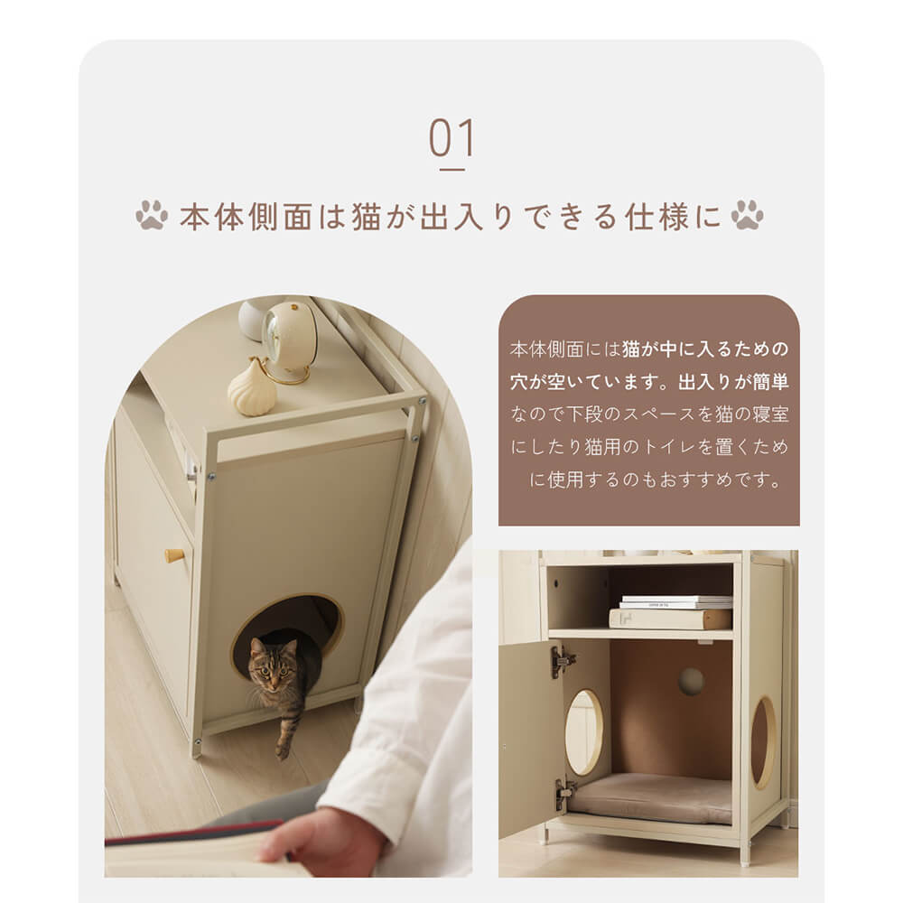 本体の側面には猫が自由に出入りできる丸い穴があり、下段スペースは猫の寝室やトイレ置き場として活用できます。両側にトンネル状の穴があるので、通り抜けもできて猫も楽しく遊べます。