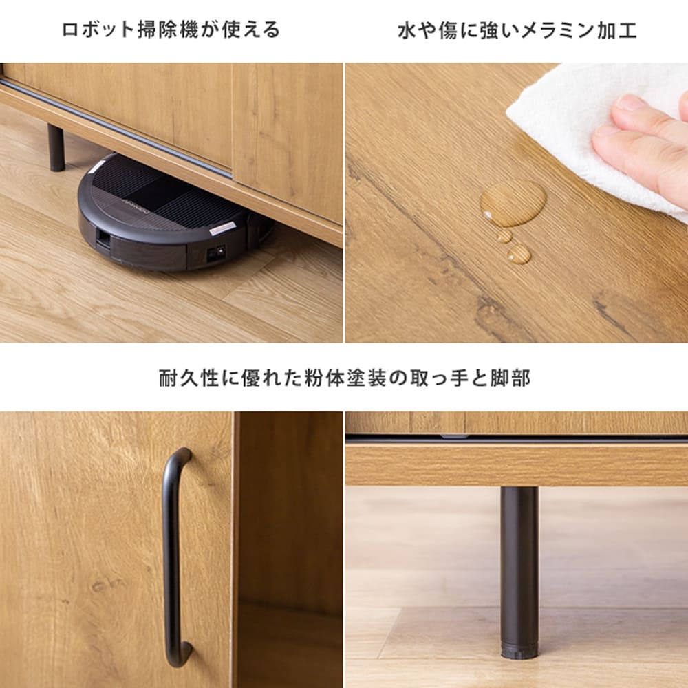 ブラックアイアンの脚と取っ手が空間を引き締め、ロボット掃除機にも対応した設計でお手入れもラクラク。