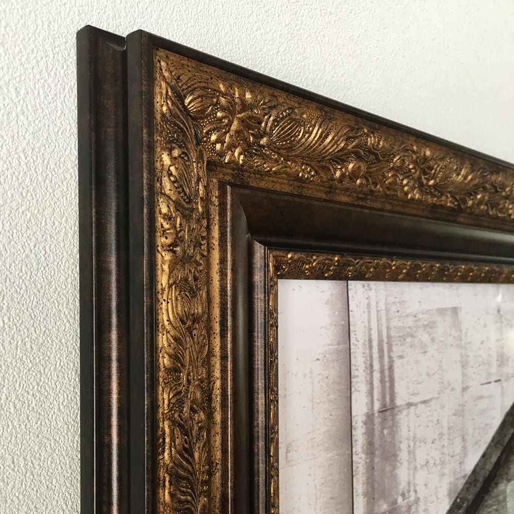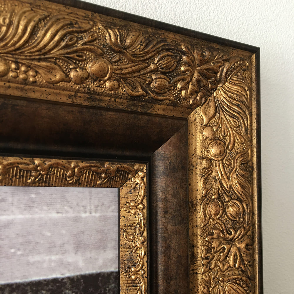 このレプリカは、作品のインパクトを引き立てるゴージャスなアンティーク調フレームに収められ、サイズは約54.2×64.3×3cm。