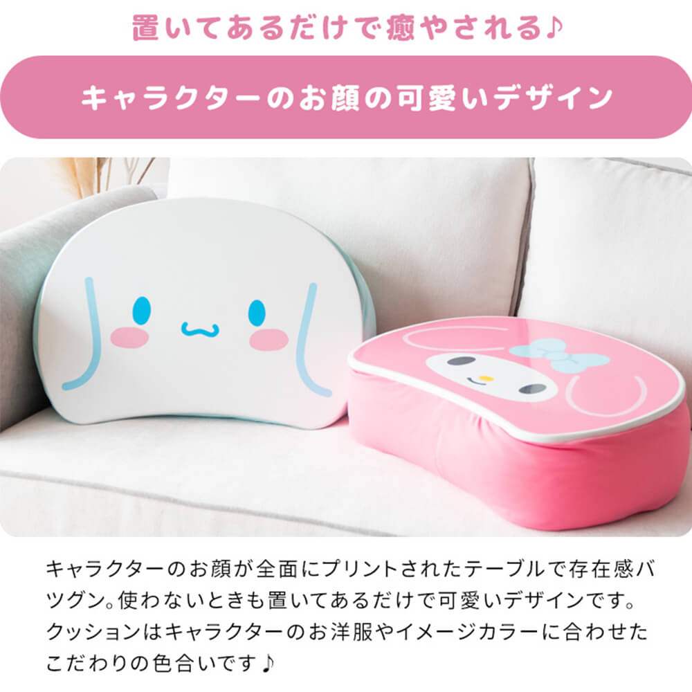 キャラクターのお顔が全面にプリントされたテーブルで存在感バツグン。使わないときも置いてあるだけで可愛いデザインです。クッションはキャラクターのお洋服やイメージカラーに合わせたこだわりの色合いです♪